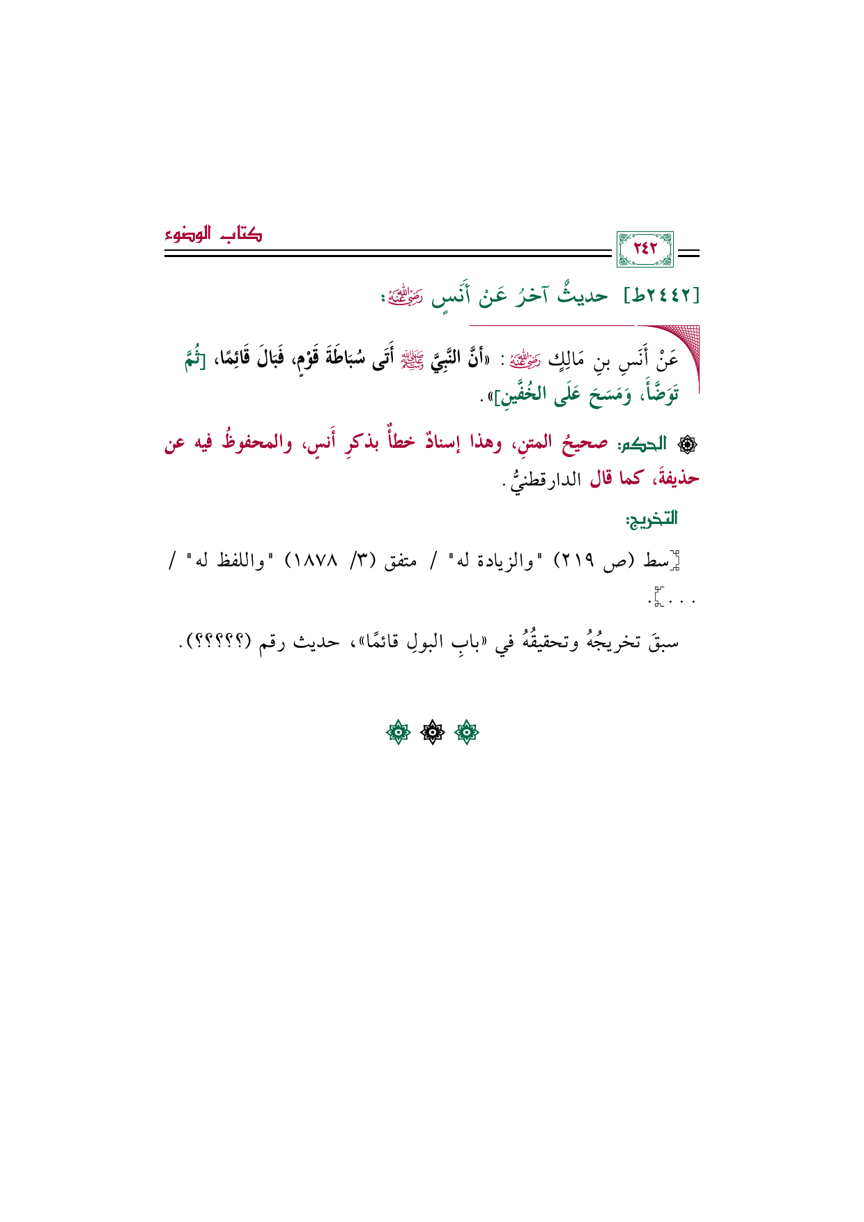 ◼ عَنْ أَنَسِ بْنِ مَالِكٍ رضي الله عنه: ((أنَّ النَّبِيَّ صلى الله عليه وسلم أَتَى سُبَاطَةَ قَوْمٍ، فَبَالَ قَائِمًا، [ثُمَّ تَوَضَّأَ، وَمَسَحَ عَلَى الخُفَّينِ])).