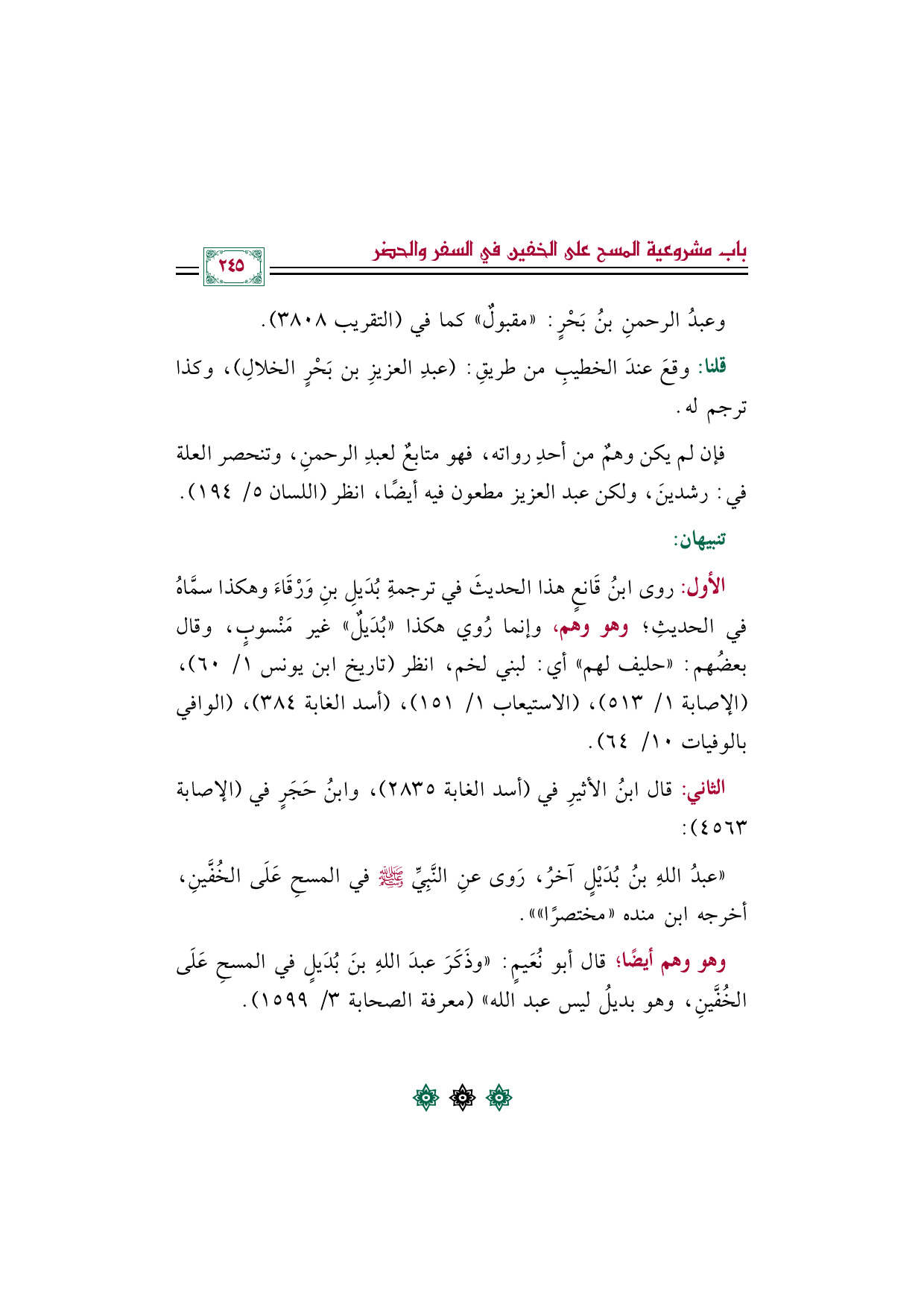 وهو وهم أيضًا؛ قال أبو نُعَيمٍ: "وذَكَرَ عبدَ اللهِ بنَ بُدَيلٍ في المسحِ عَلَى الخُفَّينِ، وهو بديلُ ليس عبد الله" (معرفة الصحابة ٣/ ١٥٩٩).
