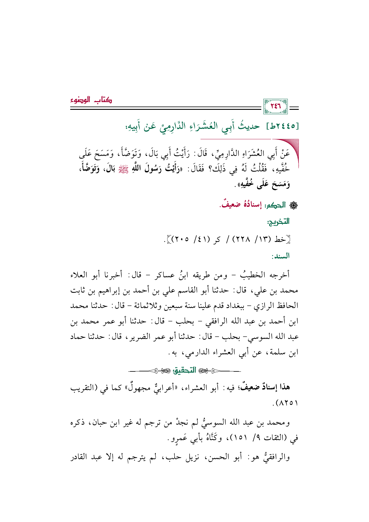 ◼ عَنْ أَبِي العُشَرَاءِ الدَّارِمِيِّ، قَالَ: رَأَيْتُ أَبِي بَالَ، وَتَوَضَّأَ، وَمَسَحَ عَلَى خُفَّيهِ، فَقُلْتُ لَهُ فِي ذَلِكَ؟ فَقَالَ: ((رَأَيْتُ رَسُولَ اللَّهِ صلى الله عليه وسلم بَالَ، وَتَوَضَّأَ، وَمَسَحَ عَلَى خُفَّيهِ)).
