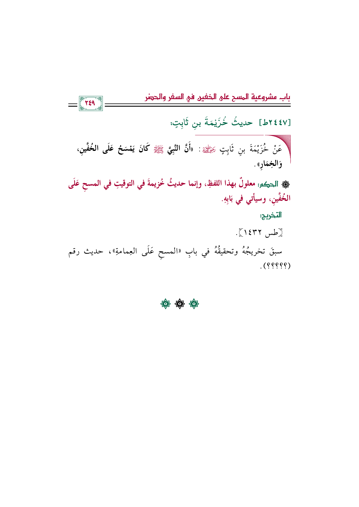 ◼ عَنْ خُزَيْمَةَ بْنِ ثَابِتٍ رضي الله عنه: ((أَنَّ النَّبِيَّ صلى الله عليه وسلم كَانَ يَمْسَحُ عَلَى الخُفَّينِ، وَالخِمَارِ)).