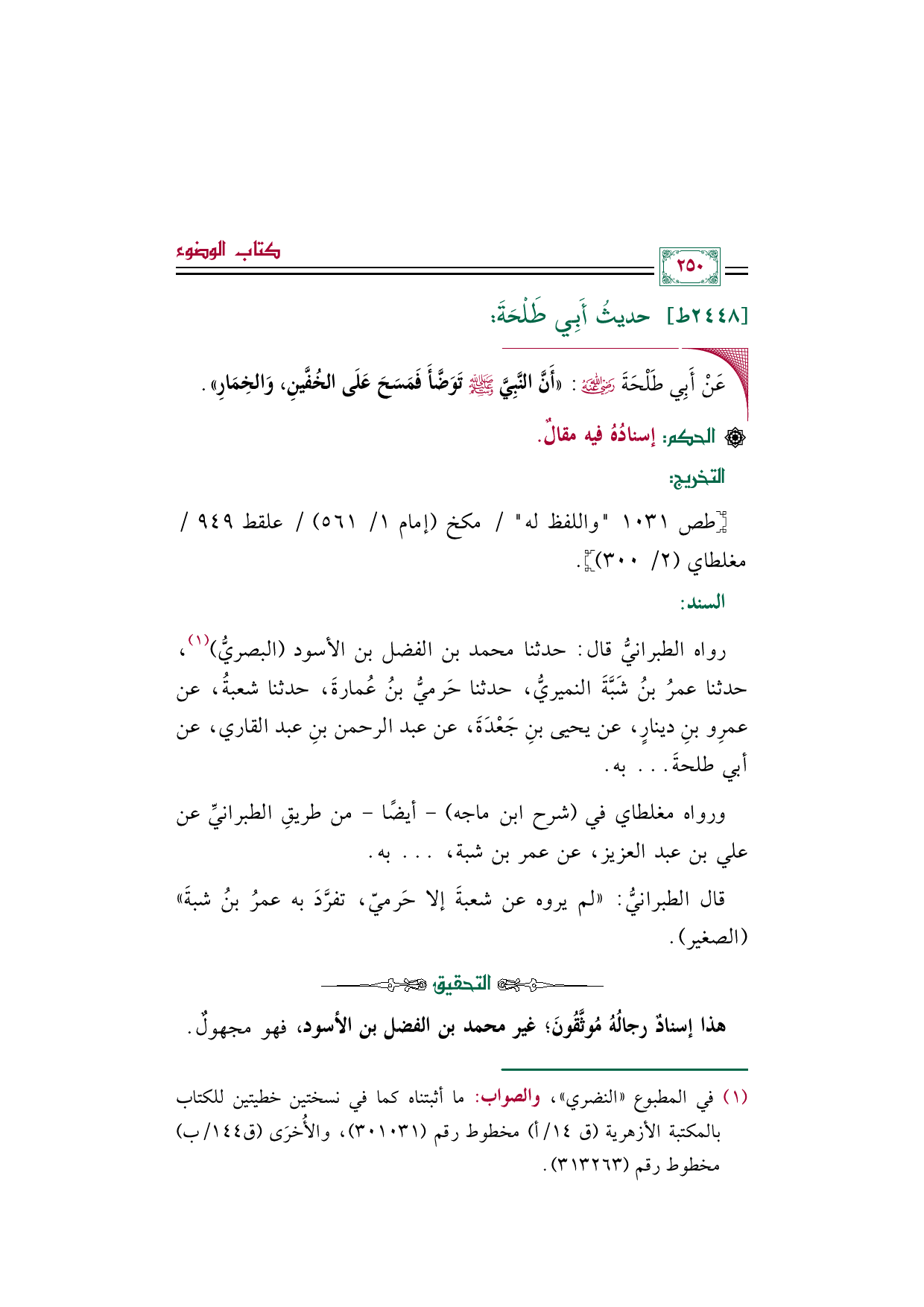 ◼ عَنْ أَبِي طَلْحَةَ رضي الله عنه: ((أَنَّ النَّبِيَّ صلى الله عليه وسلم تَوَضَّأَ فَمَسَحَ عَلَى الخُفَّينِ، وَالخِمَارِ)).