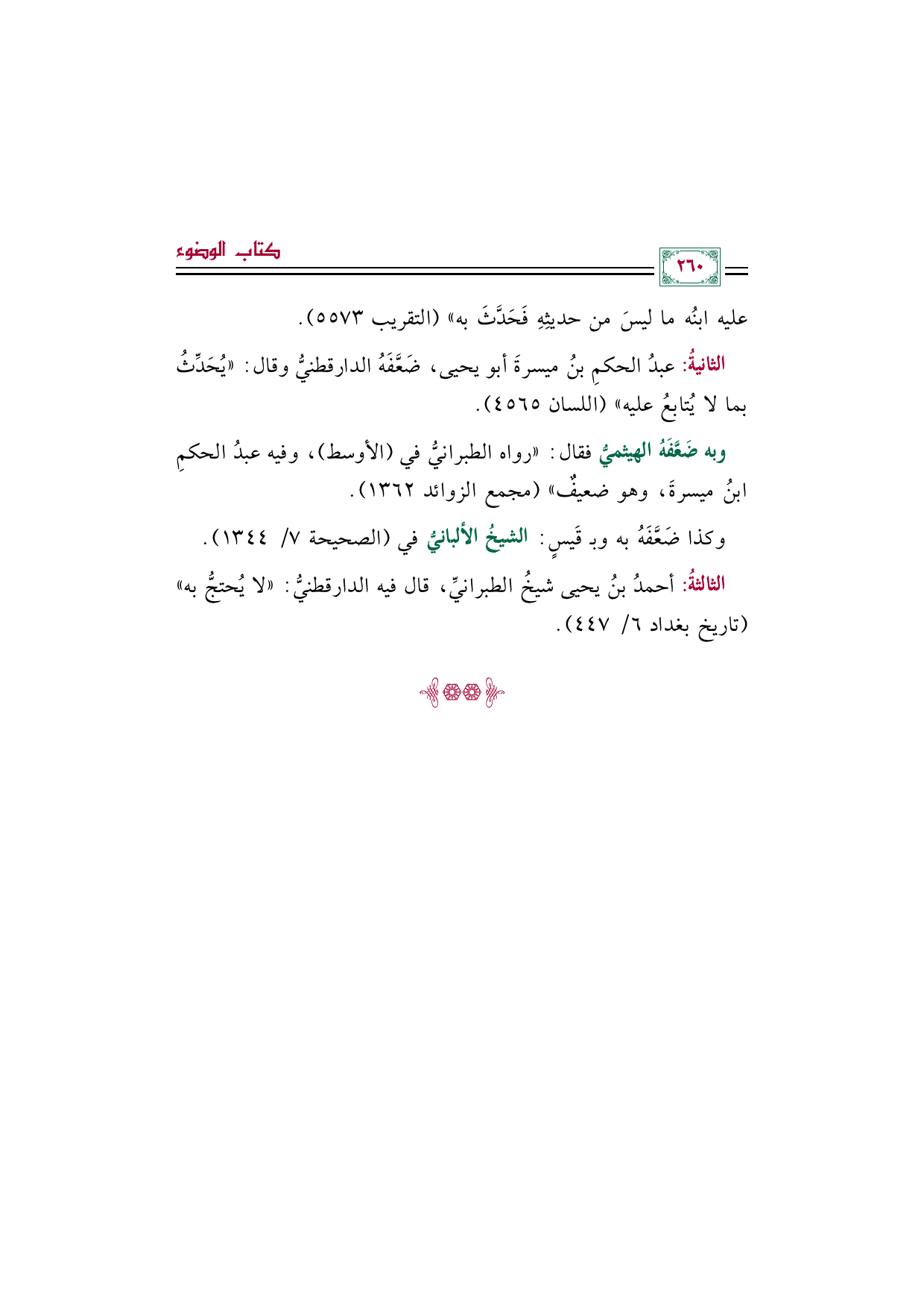 الثانيةُ: عبد الحكم بن ميسرة أبو يحيى، ضَعَّفَهُ الدارقطنيُّ وقال: "يُحَدِّثُ بما لا يُتابعُ عليه" (اللسان ٤٥٦٥).