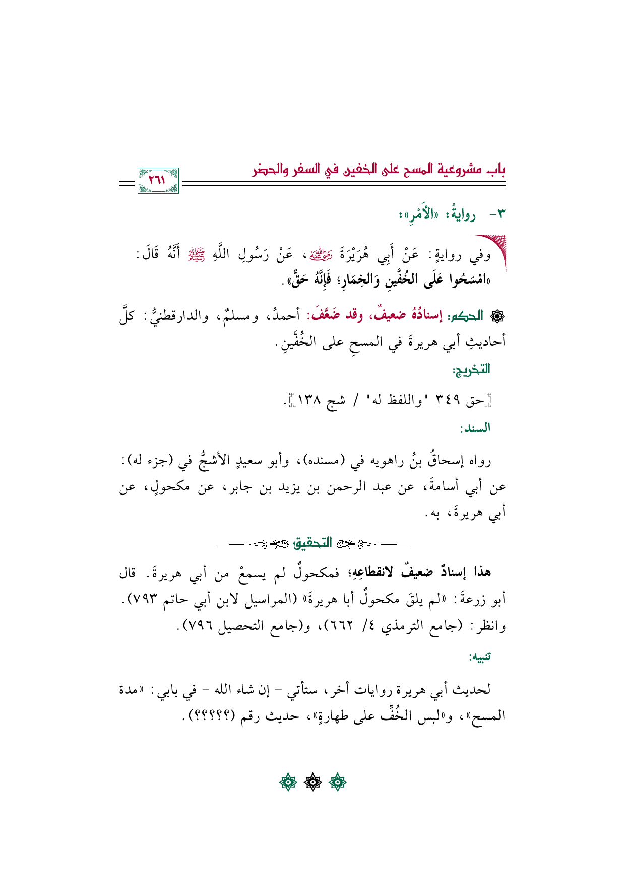 • وفي روايةٍ: عَنْ أَبِي هُرَيْرَةَ رضي الله عنه، عَنْ رَسُولِ اللَّهِ صلى الله عليه وسلم أَنَّهُ قَالَ: ((امْسَحُوا عَلَى الخُفَّينِ وَالخِمَارِ؛ فَإِنَّهُ حَقٌّ)).