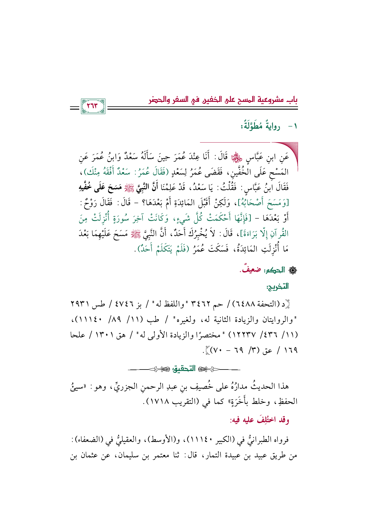 ◼ عَنِ ابنِ عَبَّاسٍ رضي الله عنهما قَالَ: أَنَا عِنْدَ عُمَرَ حِينَ سَأَلَهُ سَعْدٌ وَابْنُ عُمَرَ عَنِ المَسْحِ عَلَى الخُفَّينِ، فَقَضَى عُمَرُ لِسَعْدٍ (فَقَالَ عُمَرُ: سَعْدٌ أَفْقَهُ مِنْكَ)، فَقَالَ ابْنُ عَبَّاسٍ: فَقُلْتُ: يَا سَعْدُ، قَدْ عَلِمْنَا أَنَّ النَّبِيَّ صلى الله عليه وسلم مَسَحَ عَلَى خُفَّيهِ [وَمَسَحَ أَصْحَابُهُ]، وَلَكِنْ أَقَبْلَ المَائِدَةِ أَمْ بَعْدَهَا؟ -قَالَ: فَقَالَ رَوْحٌ: أَوْ بَعْدَهَا-[فَإِنَّهَا أَحْكَمَتْ كُلَّ شَيءٍ، وَكَانَتْ آخِرَ سُورَةٍ أُنْزِلَتْ مِنَ القُرآنِ إِلّا بَرَاءَةَ]، قَالَ: لا يُخْبِرُكَ أَحَدٌ، أَنَّ النَّبِيَّ صلى الله عليه وسلم مَسَحَ عَلَيْهِمَا بَعْدَ مَا أُنْزِلَتِ المَائِدَةُ، فَسَكَتَ عُمَرُ (فَلَمْ يَتَكَلَمْ أَحَدٌ).