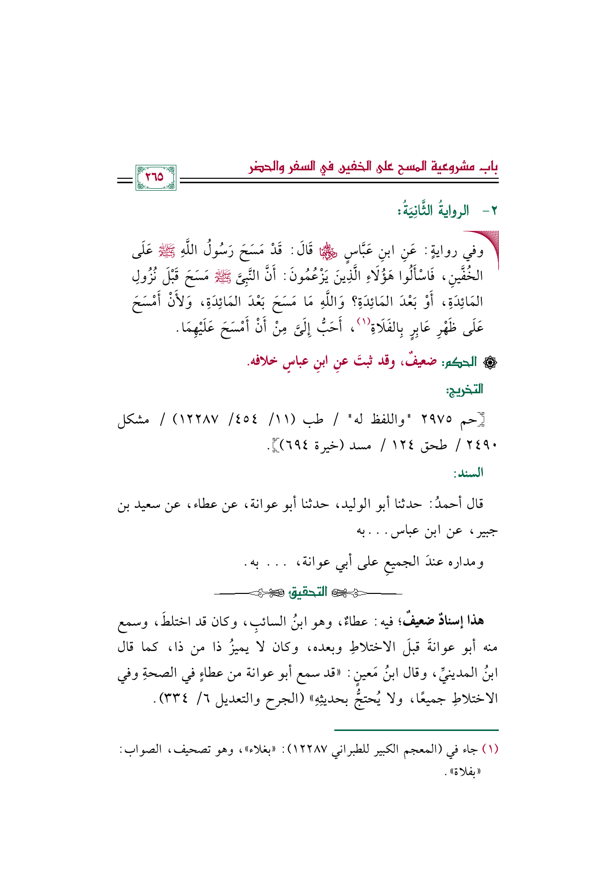 هذا إسنادٌ ضعيفٌ؛ فيه: عطاءٌ، وهو ابنُ السائبِ، وكان قد اختلطَ، وسمع منه أبو عوانةَ قبلَ الاختلاطِ وبعده، وكان لا يميز ذا من ذا، كما قال ابنُ المدينيِّ، وقال ابنُ مَعينٍ: "قد سمع أبو عوانة من عطاءٍ فى الصحةِ وفي الاختلاطِ جميعًا، ولا يُحتجُّ بحديثِهِ" (الجرح والتعديل ٦/ ٣٣٤).