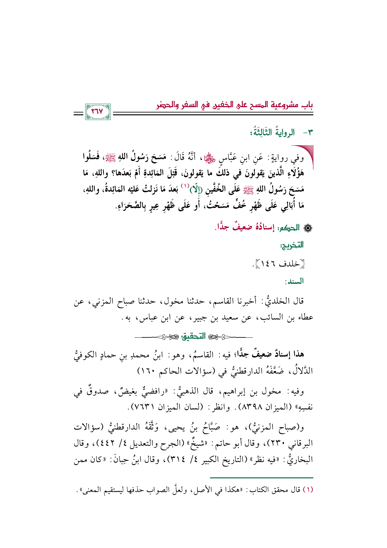 • وفي روايةٍ: عَنِ ابنِ عَبَّاسٍ رضي الله عنهما، أنَّهُ قَالَ: مَسَحَ رَسُولُ اللهِ صلى الله عليه وسلم، فَسَلُوا هَؤُلَاءِ الَّذينَ يَقولونَ في ذلكَ ما يَقولونَ، قَبْلَ المَائِدةِ أَمْ بَعدَها؟ واللهِ، مَا مَسَحَ رَسُولُ اللهِ صلى الله عليه وسلم عَلَى الخُفَّينِ (إِلّا) (¬١) بَعدَ مَا نَزلتْ عَليْه المَائِدةُ، واللهِ، مَا أُبَالِي عَلَى ظَهْرِ خُفٍّ مَسَحْتُ، أَو عَلَى ظَهْرِ عِيرٍ بِالصَّحَرَاءِ.