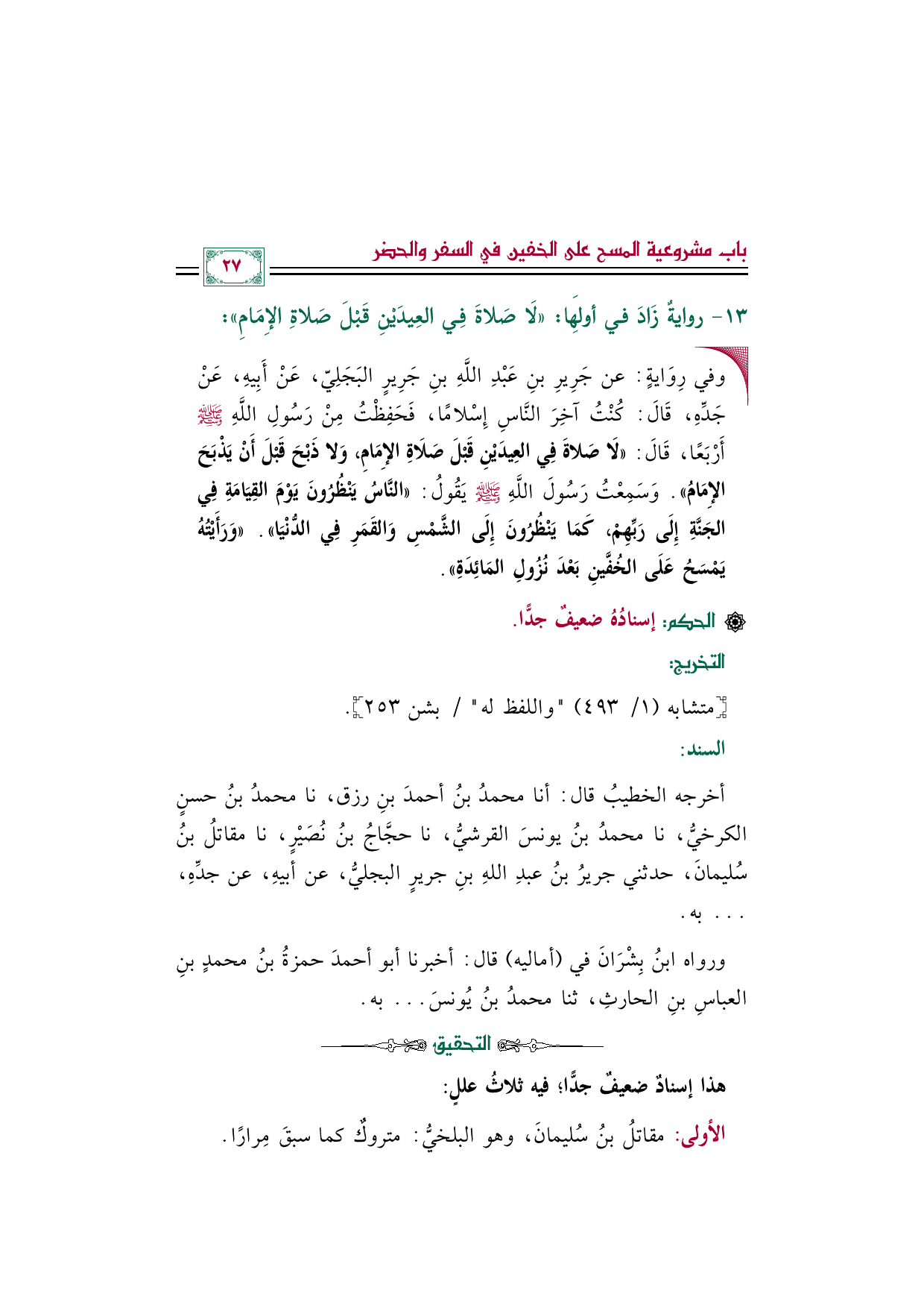 أخرجه الخطيبُ قال: أنا محمدُ بنُ أحمدَ بنِ رزق، نا محمدُ بنُ حسنٍ الكرخيُّ، نا محمدُ بنُ يونسَ القرشيُّ، نا حجَّاجُ بنُ نُصَيْرٍ، نا مقاتلُ بنُ سُليمانَ، حدثني جريرُ بنُ عبدِ اللهِ بنِ جريرٍ البجليُّ، عن أبيهِ، عن جدِّهِ، ... به.