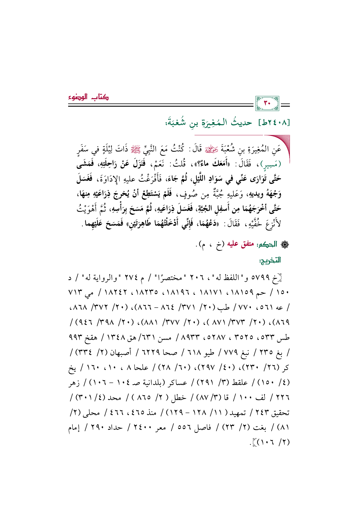 ◼ عَنِ المُغِيرَةِ بنِ شُعْبَةَ رضي الله عنه قَالَ: كُنْتُ مَعَ النَّبِيِّ صلى الله عليه وسلم ذَاتَ لِيْلَةٍ في سَفَرٍ (مَسِيرٍ)، فَقَالَ: ((أَمَعَكَ ماءٌ؟ ))، قُلتُ: نَعَمْ، فَنَزَلَ عَنْ رَاحِلَتِهِ، فَمَشَى حَتَّى تَوَارَى عَنِّي في سَوَادِ اللَّيْلِ، ثُمَّ جَاءَ، فَأَفْرَغْتُ عليهِ الإِدَاوَةَ، فَغَسَلَ وَجْهَهُ ويديهِ، وَعَليهِ جُبَّةٌ مِن صُوفٍ، فَلَمْ يَسْتَطِعْ أنْ يُخرجَ ذِرَاعَيْهِ مِنهَا، حَتَّى أخْرَجَهُمَا مِن أَسفِلِ الجُبَّةِ، فَغَسَلَ ذِرَاعَيهِ، ثُمَّ مَسَحَ بِرَأْسِهِ، ثُمَّ أَهْوَيْتُ لأَنْزِعَ خُفَّيْهِ، فَقَالَ: ((دَعْهُمَا، فَإِنِّي أَدْخَلْتُهُمَا طَاهِرَتَيْنِ)) فَمَسَحَ عَلَيْهِما.
