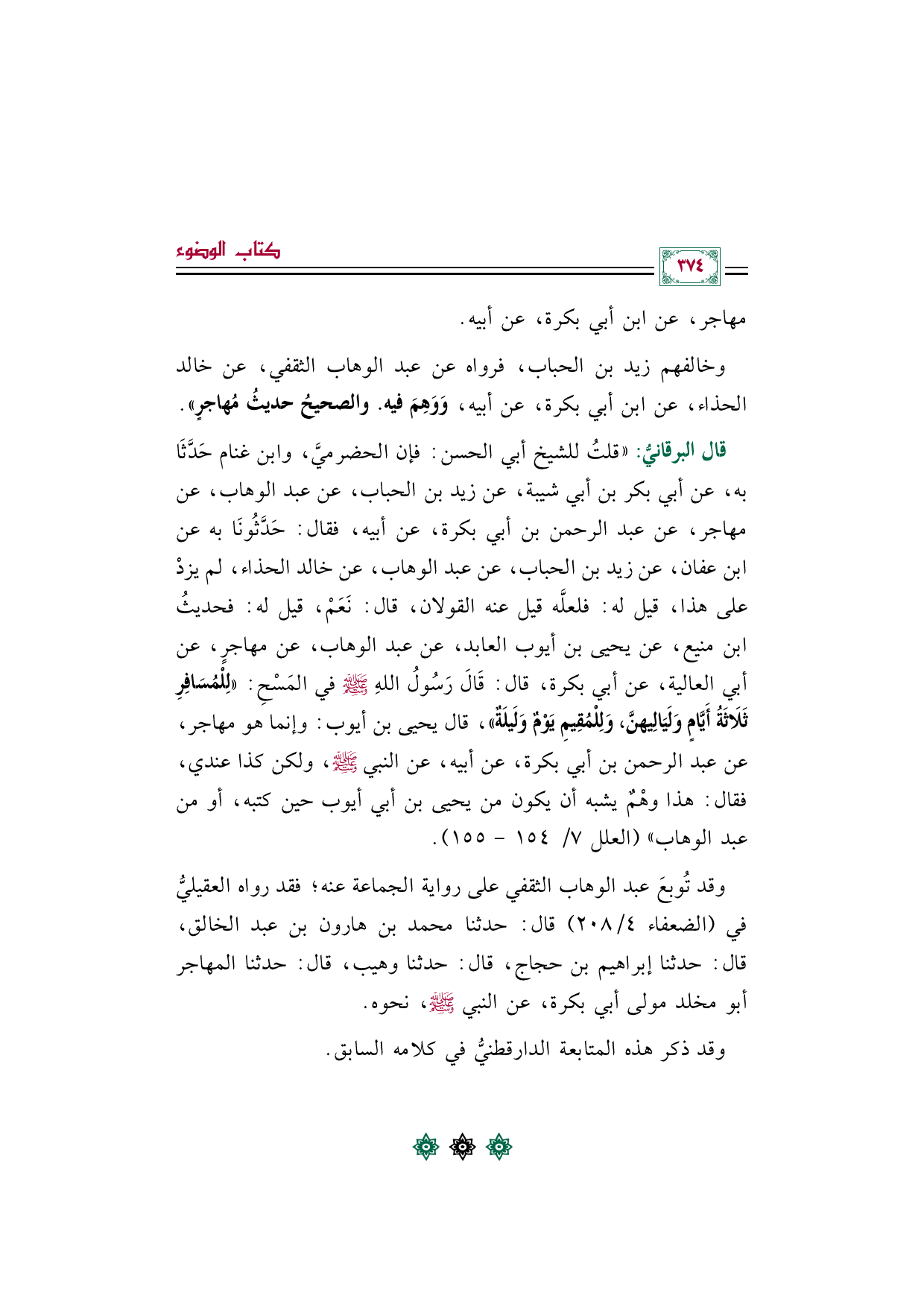 قال البرقانيُّ: "قلتُ للشيخ أبي الحسن: فإن الحضرميَّ، وابن غنام حَدَّثَا به، عن أبي بكر بن أبي شيبة، عن زيد بن الحباب، عن عبد الوهاب، عن مهاجر، عن عبد الرحمن بن أبي بكرة، عن أبيه، فقال: حَدَّثُونَا به عن ابن عفان، عن زيد بن الحباب، عن عبد الوهاب، عن خالد الحذاء، لم يزدْ على هذا، قيل له: فلعلَّه قيل عنه القولان، قال: نَعَمْ، قيل له: فحديثُ ابن منيع، عن يحيى بن أيوب العابد، عن عبد الوهاب، عن مهاجرٍ، عن أبي العالية، عن أبي بكرة، قال: قَالَ رَسُولُ اللهِ صلى الله عليه وسلم في المَسْحِ: ((لِلْمُسَافِرِ ثَلَاثَةُ أَيَّامٍ وَلَيَالِيهنَّ، وَلِلْمُقِيمِ يَوْمٌ وَلَيلَةٌ))، قال يحيى بن أيوب: وإنما هو مهاجر، عن عبد الرحمن بن أبي بكرة، عن أبيه، عن النبي صلى الله عليه وسلم، ولكن كذا عندي، فقال: هذا وهْمٌ يشبه أن يكون من يحيى بن أبي أيوب حين كتبه، أو من عبد الوهاب" (العلل ٧/ ١٥٤ - ١٥٥).