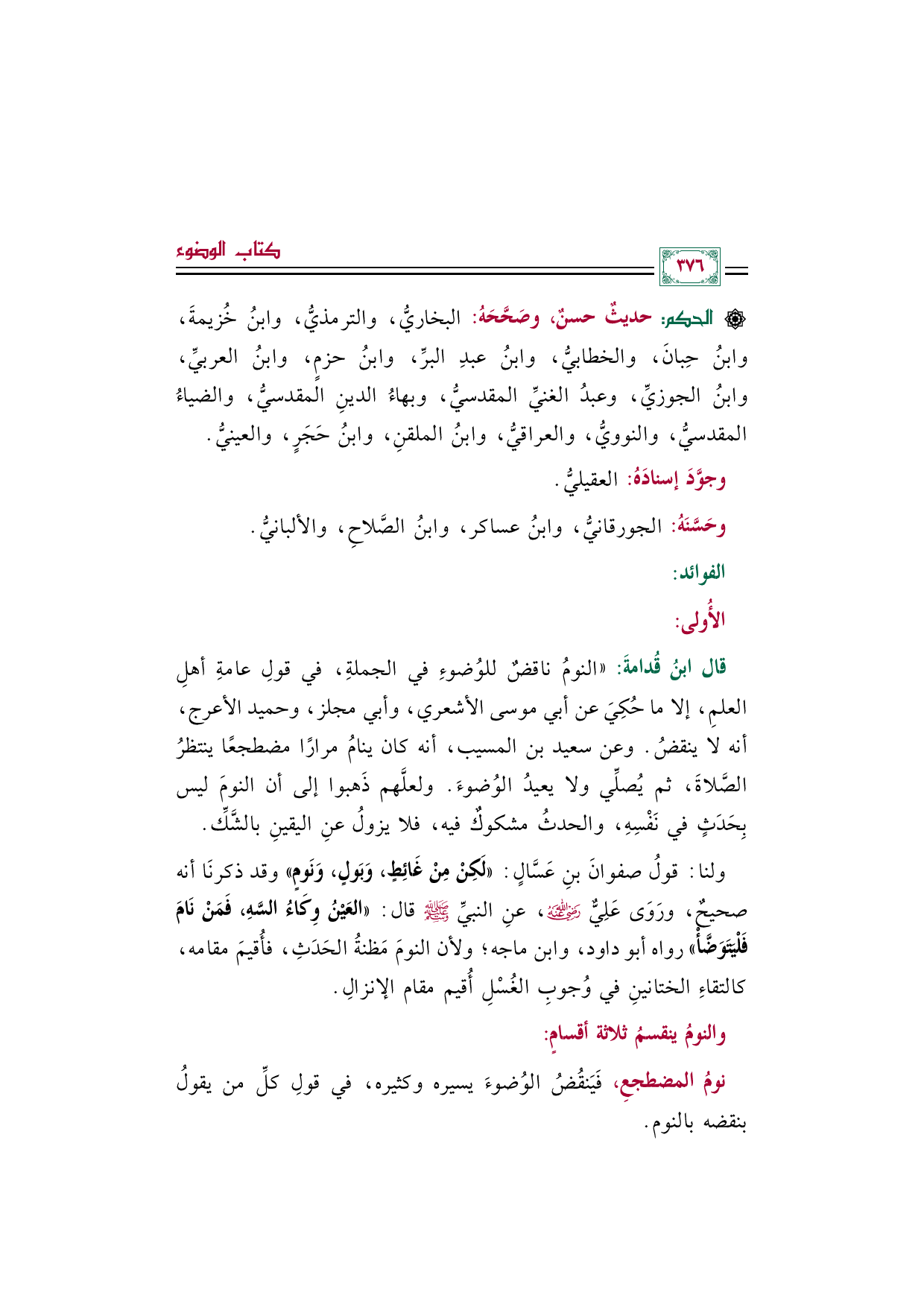ولنا: قولُ صفوانَ بنِ عَسَّالٍ: ((لَكِنْ مِنْ غَائِطٍ، وَبَولٍ، وَنَومٍ)) وقد ذكرنَا أنه صحيحٌ، ورَوَى عَلِيٌّ رضي الله عنه، عنِ النبيِّ صلى الله عليه وسلم قال: ((العَيْنُ وِكَاءُ السَّهِ، فَمَنْ نَامَ فَلْيَتَوَضَّأْ)) رواه أبو داود، وابن ماجه؛ ولأن النومَ مَظنةُ الحَدَثِ، فأُقيمَ مقامه، كالتقاءِ الختانينِ في وُجوبِ الغُسْلِ أُقيم مقام الإنزالِ.