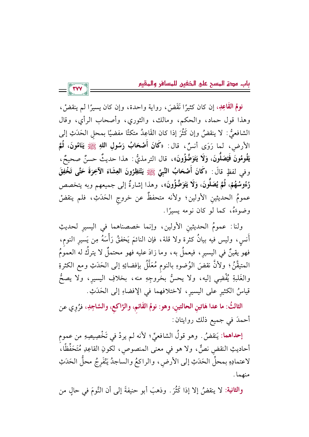 نومُ القَاعِدِ، إن كان كثيرًا نَقَضَ، رواية واحدة، وإن كان يسيرًا لم ينقضْ، وهذا قول حماد، والحكم، ومالك، والثوري، وأصحاب الرأي، وقال الشافعيُّ: لا ينقضُ وإن كَثُرَ إذا كان القَاعِدُ متكئًا مفضيًا بمحلِ الحَدَثِ إلى الأرضِ، لما رَوَى أنسٌ، قال: ((كَانَ أَصْحَابُ رَسُولِ اللهِ صلى الله عليه وسلم يَنَامُونَ، ثُمَّ يَقُومُونَ فَيُصَلُّونَ، وَلَا يَتَوَضَّؤُونَ))، قال الترمذيُّ: هذا حديثٌ حسنٌ صحيحٌ، وفي لفظٍ قالَ: ((كَانَ أَصْحَابُ النَّبِيِّ صلى الله عليه وسلم يَنْتَظِرُونَ العِشَاءَ الآخِرَةَ حَتَّى تَخْفِقَ رُءُوسُهُمْ، ثُمَّ يُصَلُّونَ، وَلَا يَتَوَضَّؤُونَ))، وهذا إشارةٌ إلى جميعهم وبه يتخصص عمومُ الحديثينِ الأولين؛ ولأنه متحفظٌ عن خروجِ الحَدَثِ، فلم ينقضْ وضوءَهُ، كما لو كان نومه يسيرًا.