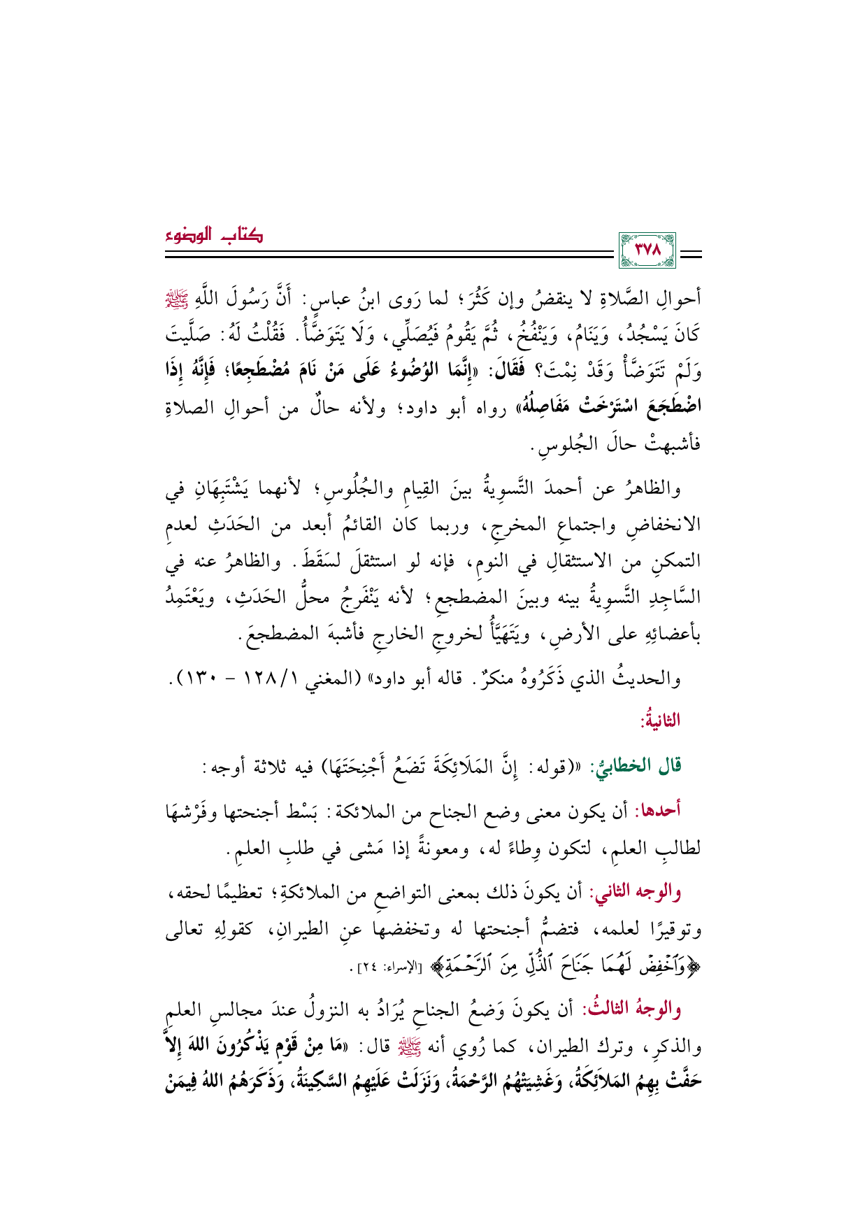 والوجهُ الثالثُ: أن يكونَ وَضعُ الجناحِ يُرَادُ به النزولُ عندَ مجالسِ العلمِ والذكرِ، وترك الطيران، كما رُوي أنه صلى الله عليه وسلم قال: ((مَا مِنْ قَوْمٍ يَذْكُرُونَ اللهَ إِلَاّ حَفَّتْ بِهِمُ المَلائِكَةُ، وَغَشِيَتْهُمُ الرَّحْمَةُ، وَنَزَلَتْ عَلَيْهِمُ السَّكِينَةُ، وَذَكَرَهُمُ اللهُ فِيمَنْ