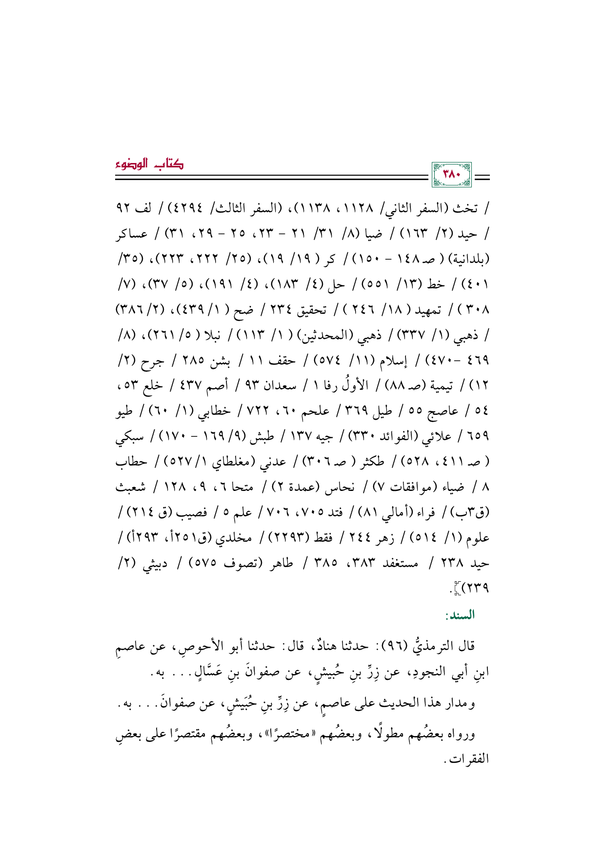 قال الترمذيُّ (٩٦): حدثنا هنادٌ، قال: حدثنا أبو الأحوصِ، عن عاصمِ بنِ أبي النجودِ، عن زِرِّ بنِ حُبيشٍ، عن صفوانَ بنِ عَسَّالٍ ... به.