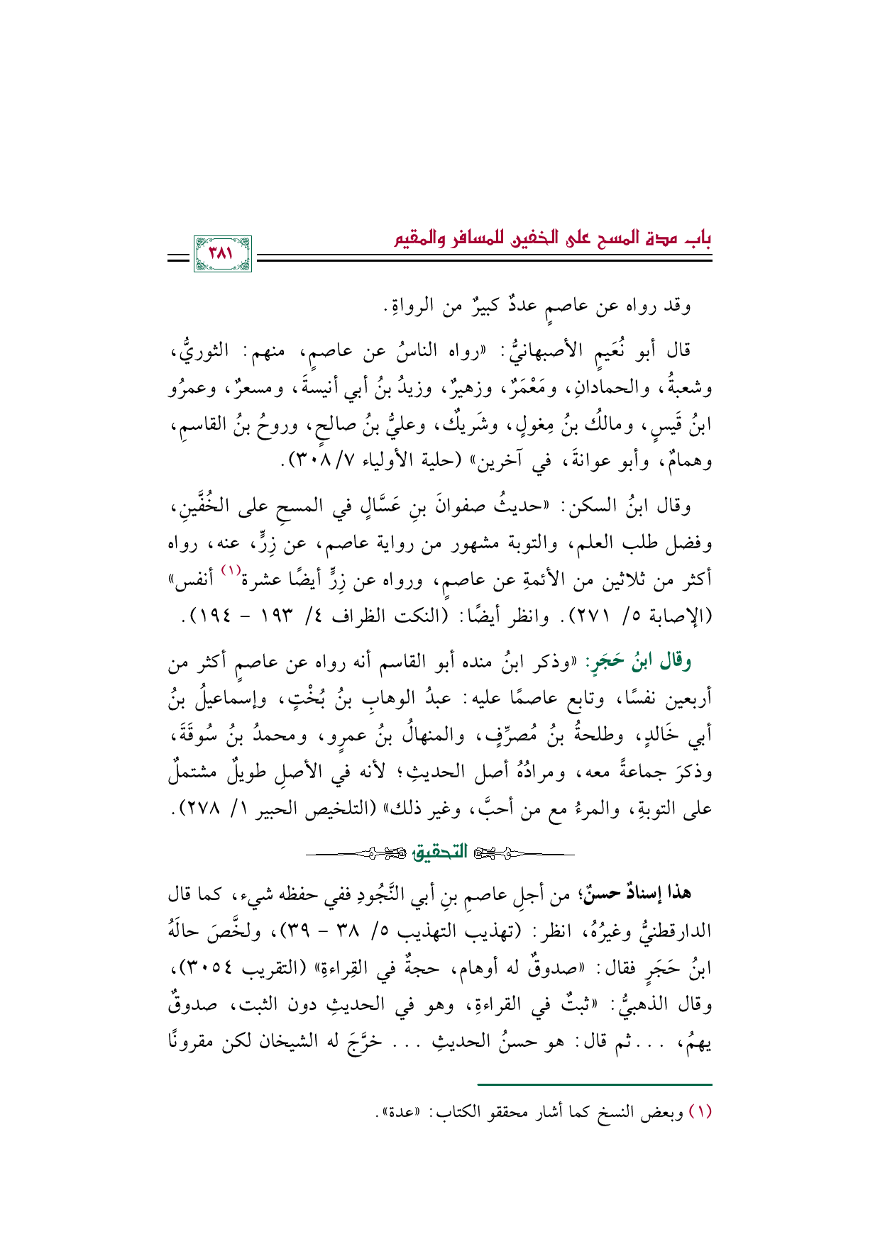 وقال ابنُ حَجَرٍ: ((وذكر ابنُ منده أبو القاسم أنه رواه عن عاصمٍ أكثر من أربعين نفسًا، وتابع عاصمًا عليه: عبدُ الوهابِ بنُ بُخْتٍ، وإسماعيلُ بنُ أبي خَالدٍ، وطلحةُ بنُ مُصرِّفٍ، والمنهالُ بنُ عمرٍو، ومحمدُ بنُ سُوقَةَ، وذكرَ جماعةً معه، ومرادُهُ أصل الحديثِ؛ لأنه في الأصلِ طويلٌ مشتملٌ على التوبةِ، والمرءُ مع من أحبَّ، وغير ذلك)) (التلخيص الحبير ١/ ٢٧٨).