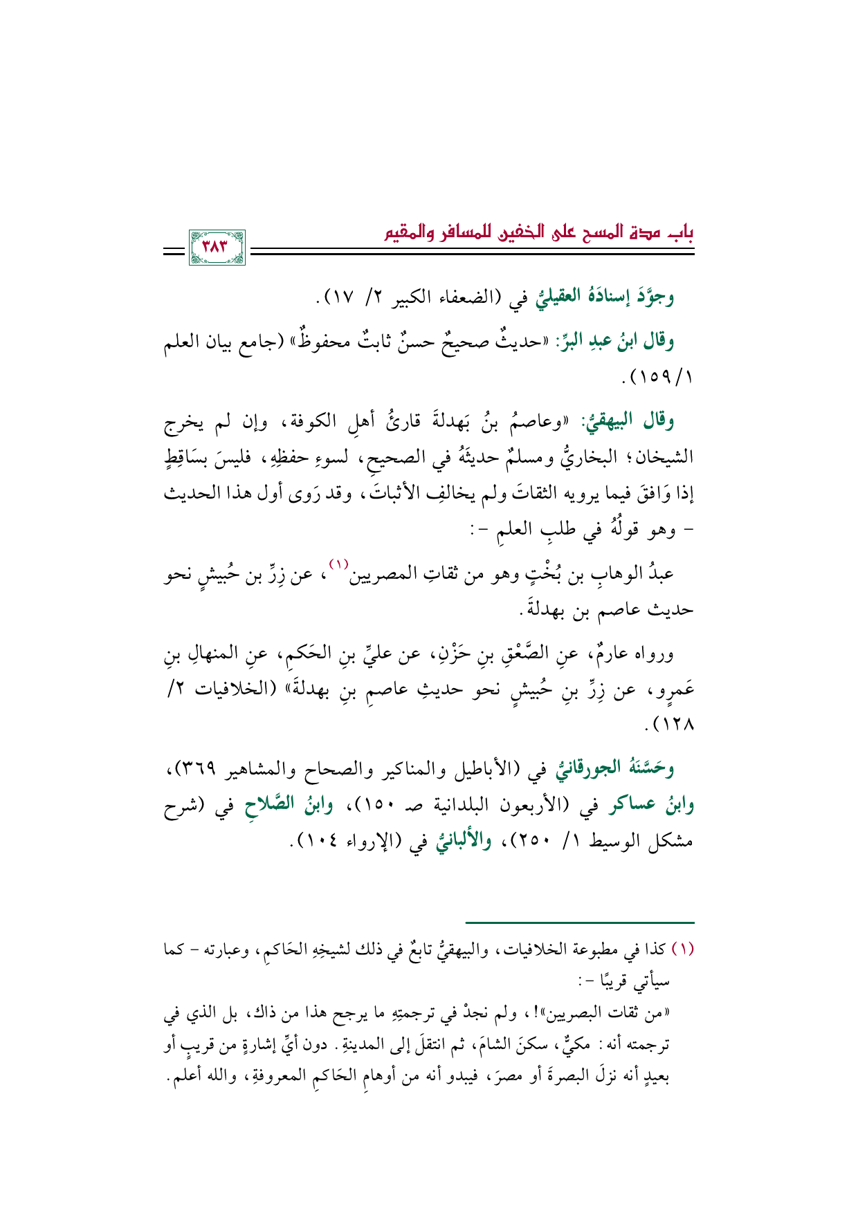 وقال البيهقيُّ: ((وعاصمُ بنُ بَهدلةَ قارئُ أهلِ الكوفة، وإن لم يخرج الشيخان؛ البخاريُّ ومسلمٌ حديثَهُ في الصحيحِ، لسوءِ حفظِهِ، فليسَ بسَاقِطٍ إذا وَافقَ فيما يرويه الثقاتَ ولم يخالفِ الأثباتَ، وقد رَوى أول هذا الحديث -وهو قولُهُ في طلبِ العلمِ-: