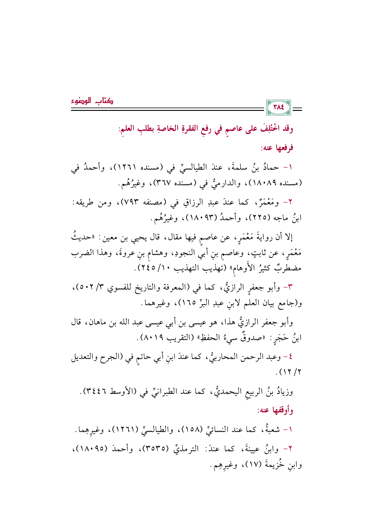 وقد اخْتُلِفَ على عاصمٍ في رفعِ الفقرةِ الخاصةِ بطلبِ العلمِ: