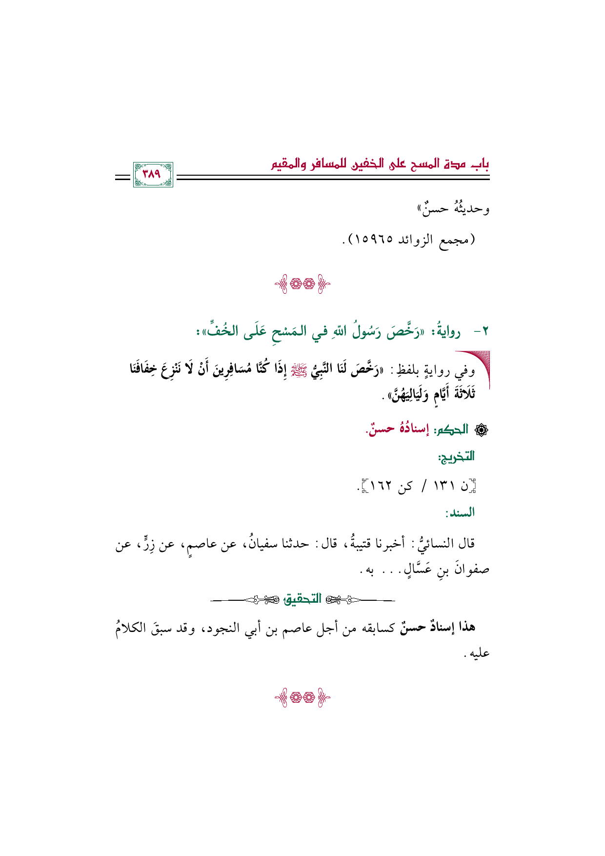 قال النسائيُّ: أخبرنا قتيبة، قال: حدثنا سفيان، عن عاصم، عن زِرٍّ، عن صفوان بن عَسَّال ... به.
