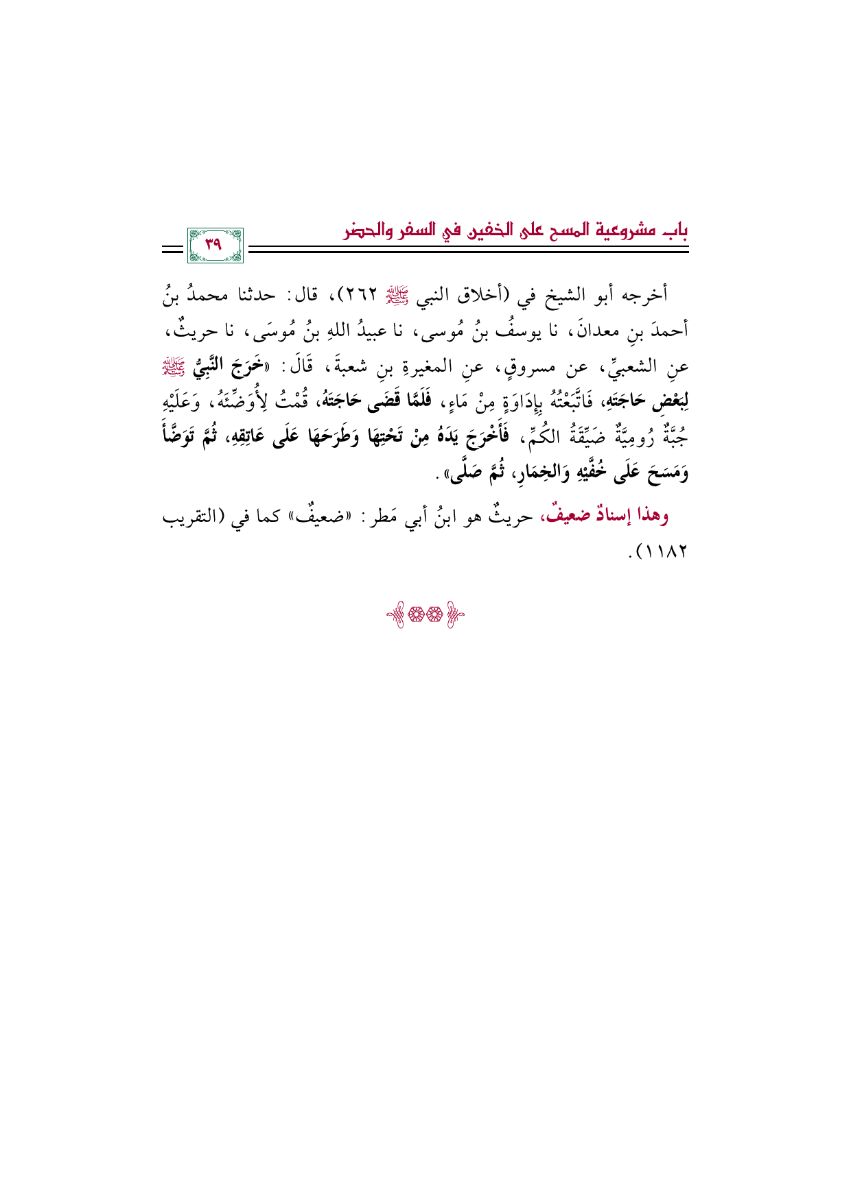 أخرجه أبو الشيخ في (أخلاق النبي صلى الله عليه وسلم ٢٦٢)، قال: حدثنا محمدُ بنُ أحمدَ بنِ معدانَ، نا يوسفُ بنُ مُوسى، نا عبيدُ اللهِ بنُ مُوسَى، نا حريثٌ، عنِ الشعبيِّ، عن مسروقٍ، عنِ المغيرةِ بنِ شعبةَ، قَالَ: ((خَرَجَ النَّبِيُّ صلى الله عليه وسلم لِبَعْضِ حَاجَتَهِ، فَاتَّبَعْتُهُ بِإِدَاوَةٍ مِنْ مَاءٍ، فَلَمَّا قَضَى حَاجَتَهُ، قُمْتُ لِأُوَضِّئَهُ، وَعَلَيْهِ جُبَّةٌ رُومِيَّةٌ ضَيِّقَةُ الكُمِّ، فَأَخْرَجَ يَدَهُ مِنْ تَحْتِهَا وَطَرَحَهَا عَلَى عَاتِقِهِ، ثُمَّ تَوَضَّأَ وَمَسَحَ عَلَى خُفَّيْهِ وَالخِمَارِ، ثُمَّ صَلَّى)).