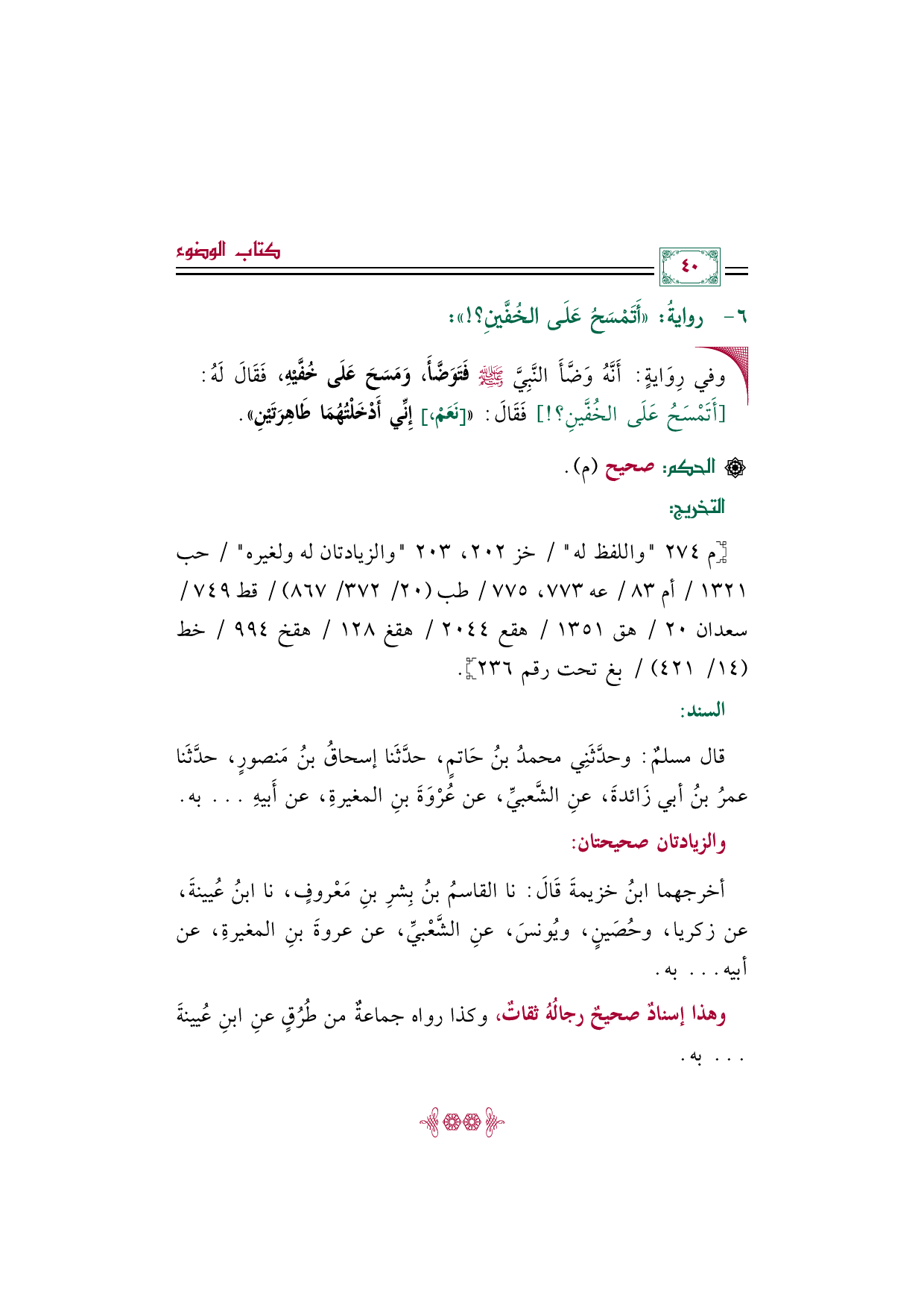 قال مسلمٌ: وحدَّثَنِي محمدُ بنُ حَاتمٍ، حدَّثَنا إسحاقُ بنُ مَنصورٍ، حدَّثَنا عمرُ بنُ أبي زَائدةَ، عنِ الشَّعبيِّ، عن عُرْوَةَ بنِ المغيرةِ، عن أَبيهِ ... به.