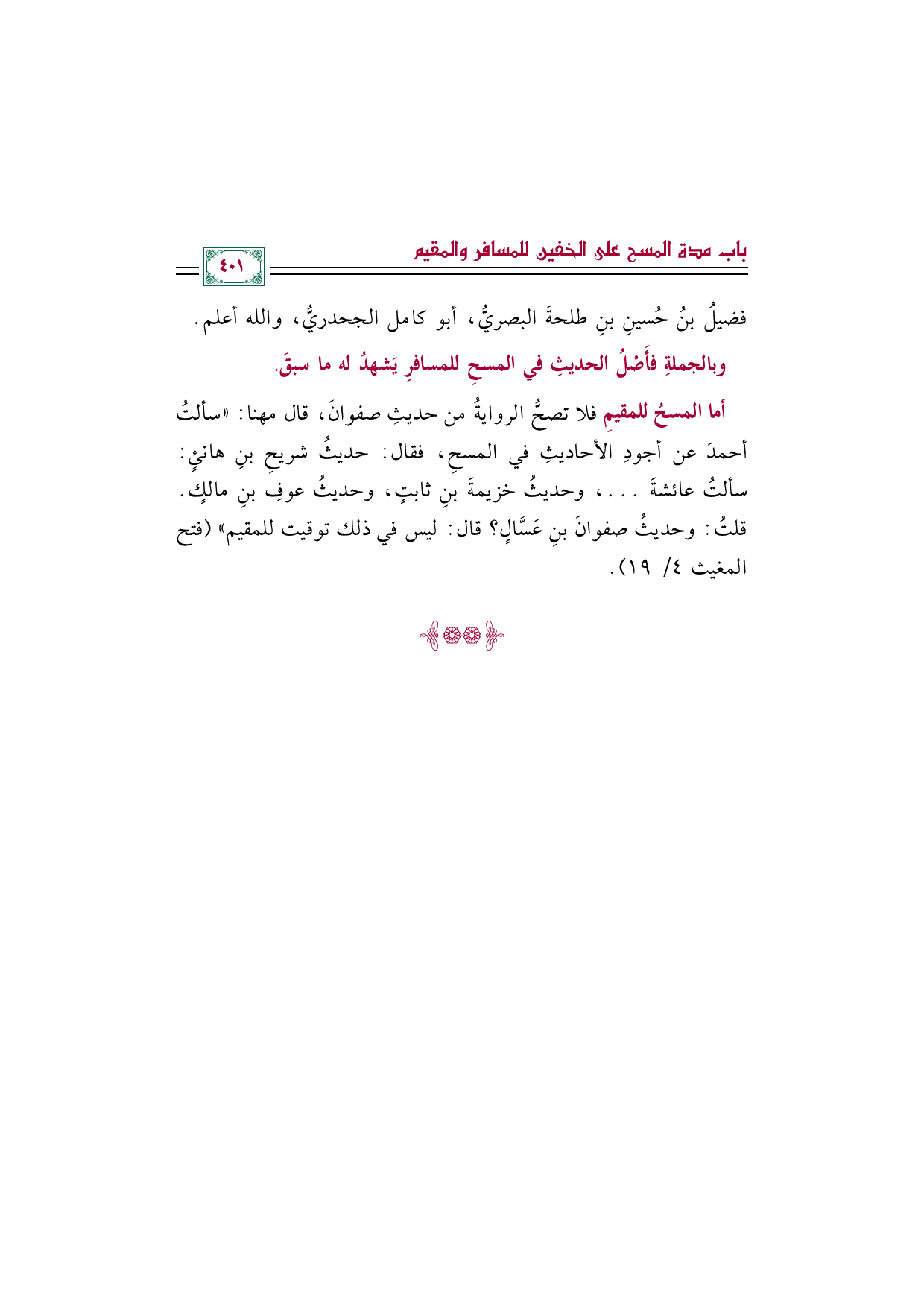 أما المسحُ للمقيمِ فلا تصحُّ الروايةُ من حديثِ صفوانَ، قال مهنا: "سألتُ أحمدَ عن أجودِ الأحاديثِ في المسحِ، فقال: حديثُ شريحِ بنِ هانئٍ: سألتُ عائشةَ ... ، وحديثُ خزيمةَ بنِ ثابتٍ، وحديثُ عوفِ بنِ مالكٍ. قلتُ: وحديثُ صفوانَ بنِ عَسَّالٍ؟ قال: ليس في ذلك توقيت للمقيم" (فتح المغيث ٤/ ١٩).