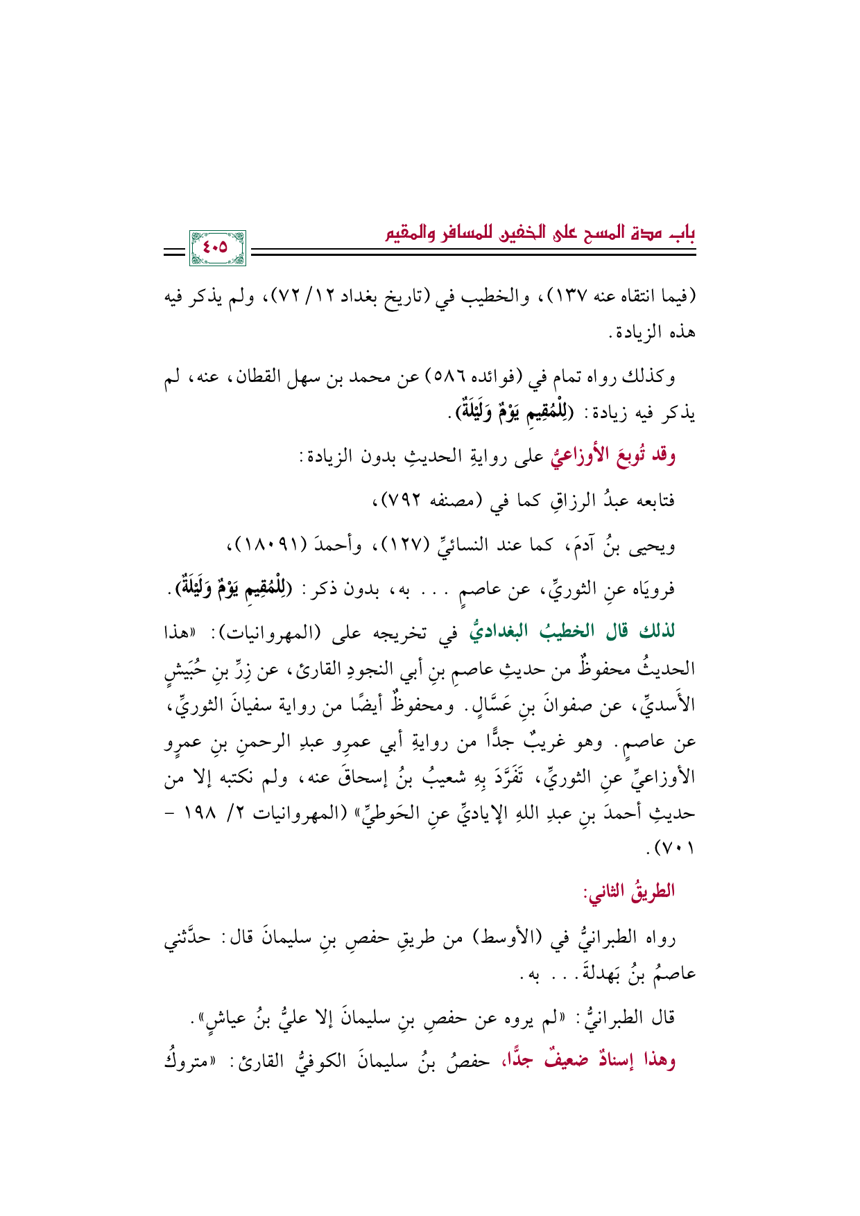 وكذلك رواه تمام في (فوائده ٥٨٦) عن محمد بن سهل القطان، عنه، لم يذكر فيه زيادة: (لِلْمُقِيمِ يَوْمٌ وَلَيْلَةٌ).