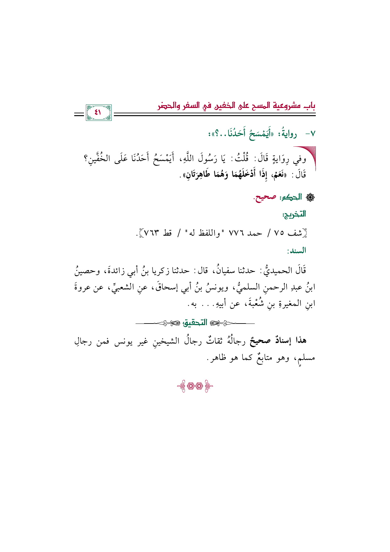 قَالَ الحميديُّ: حدثنا سفيانُ، قال: حدثنا زكريا بنُ أبي زائدةَ، وحصينُ بنُ عبدِ الرحمنِ السلميُّ، ويونسُ بنُ أبي إسحاقَ، عنِ الشعبيِّ، عن عروةَ بنِ المغيرةِ بنِ شُعْبةَ، عن أبيهِ ... به.
