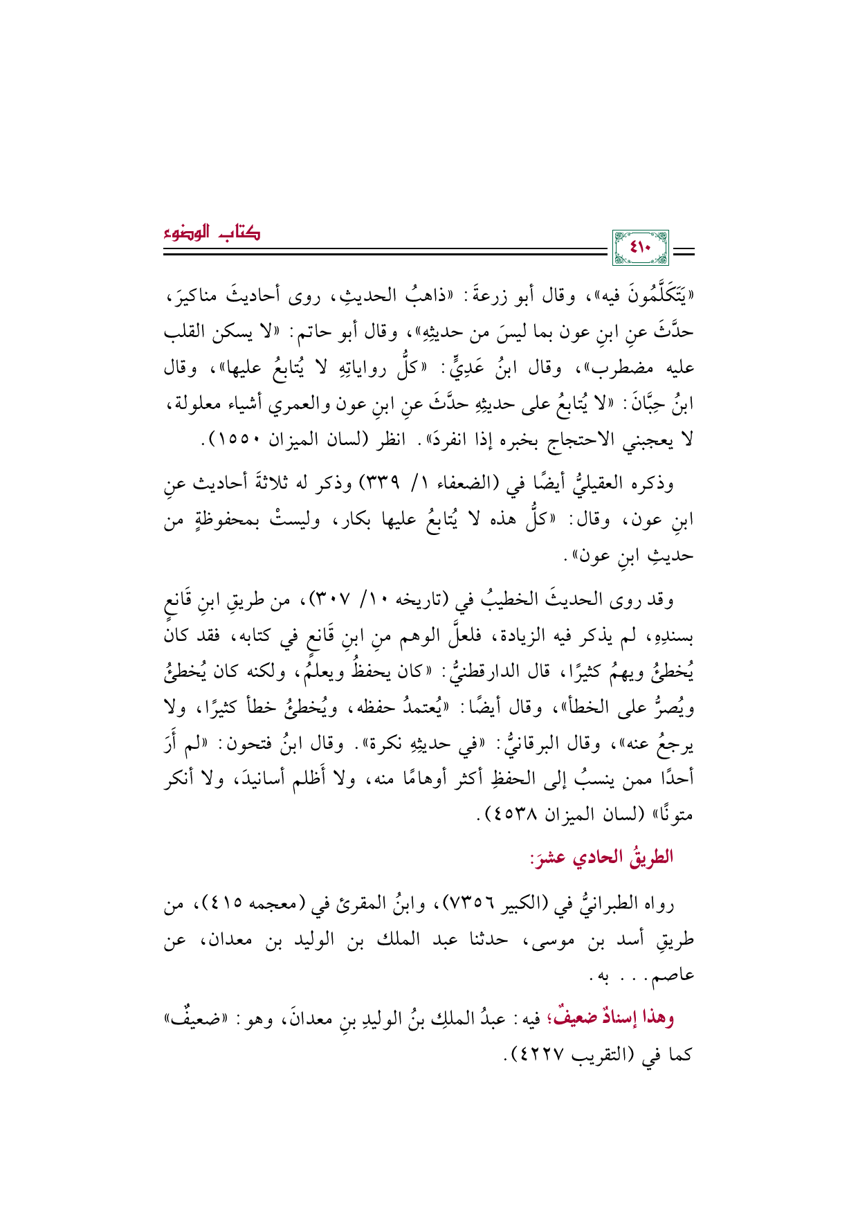 "يتكلمون فيه"، وقال أبو زرعة: "ذاهبُ الحديثِ، روى أحاديثَ مناكيرَ، حدَّثَ عنِ ابنِ عون بما ليس من حديثِهِ"، وقال أبو حاتم: "لا يسكن القلب عليه مضطرب"، وقال ابنُ عَدِيٍّ: "كلُّ رواياتِهِ لا يُتابعُ عليها"، وقال ابنُ حِبانَ: "لا يُتابعُ على حديثِهِ حدَّثَ عنِ ابنِ عون والعمري أشياء معلولة، لا يعجبني الاحتجاج بخبره إذا انفردَ". انظر (لسان الميزان ١٥٥٠). وذكره العقيليُّ أيضًا في (الضعفاء ١/ ٣٣٩) وذكر له ثلاثةَ أحاديث عنِ ابنِ عون، وقال: "كلُّ هذه لا يُتابعُ عليها بكار، وليستْ بمحفوظةٍ من حديثِ ابنِ عون".