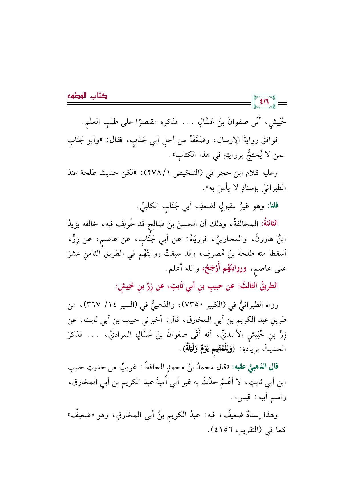 حُبَيشٍ، أَتَى صفوانَ بنَ عَسَّالٍ ... فذكره مقتصرًا على طلبِ العلمِ.