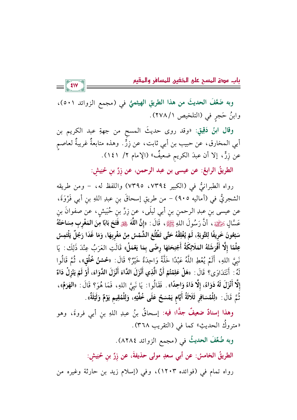 وقال ابنُ دَقيقٍ: "وقد روى حديثَ المسح من جهة عبد الكريم بن أبي المخارق، عن حبيب بن أبي ثابت، عن زِرٍّ. وهذه متابعةٌ غريبةٌ لعاصمٍ عن زِرٍّ، إلا أن عبدَ الكريمِ ضعيفٌ" (الإمام ٢/ ١٤١).