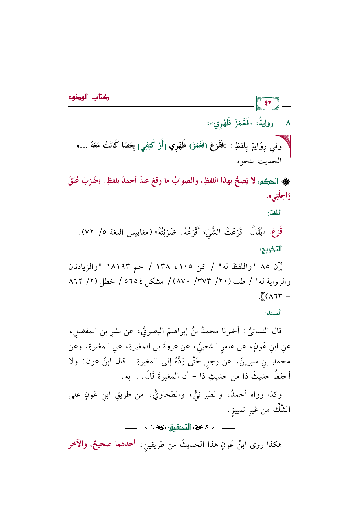 قال النسائيُّ: أخبرنا محمدُ بنُ إبراهيمَ البصريُّ، عن بشرِ بنِ المفضلِ، عنِ ابنِ عَونٍ، عن عامرٍ الشعبيِّ، عن عروةَ بنِ المغيرةِ، عنِ المغيرةِ، وعن محمدِ بنِ سيرينَ، عن رجلٍ حَتَّى رَدَّهُ إلى المغيرةِ -قال ابنُ عون: ولا أحفظُ حديثَ ذا من حديثِ ذا- أن المغيرةَ قَالَ ... به.