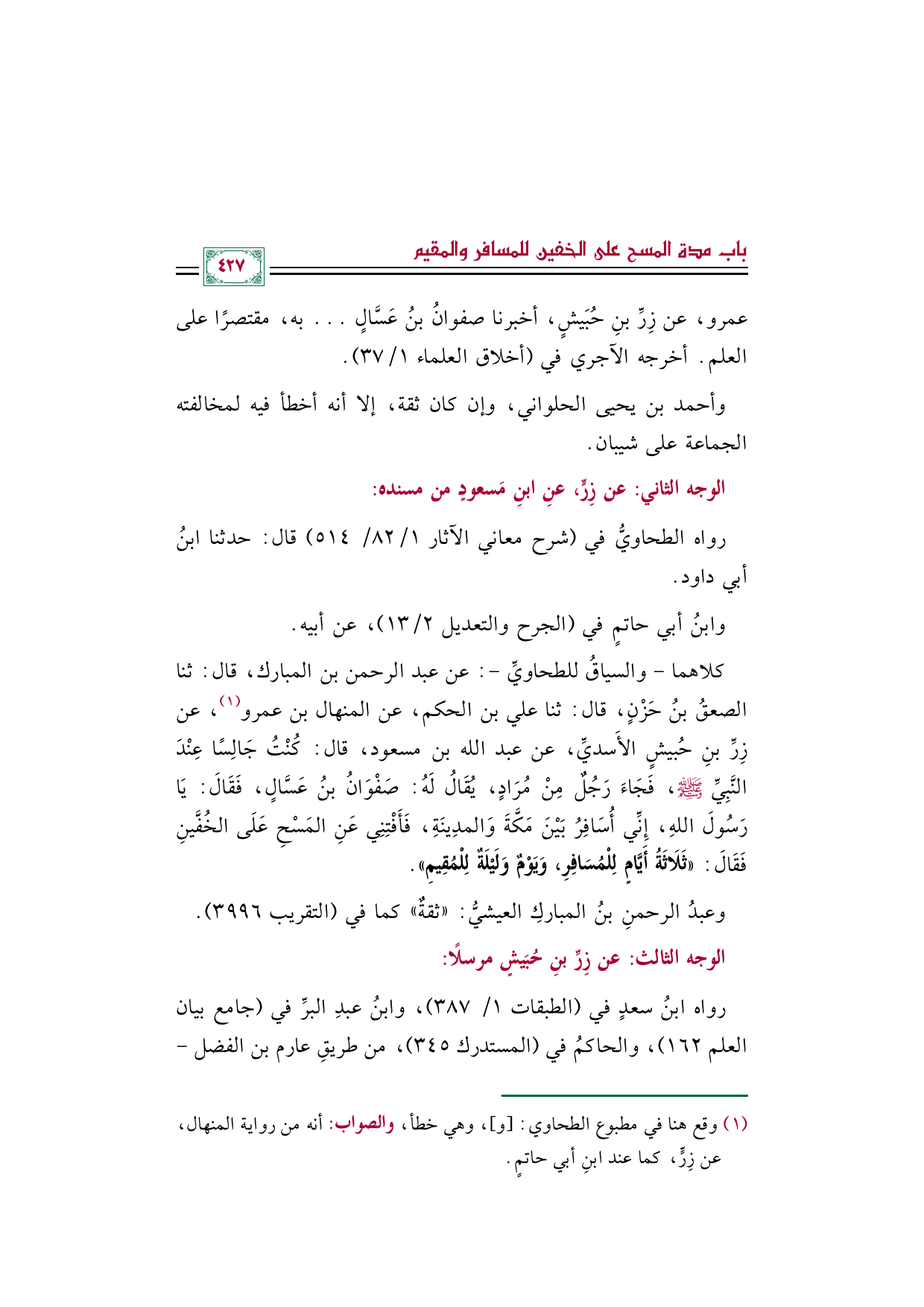 كلاهما -والسياق للطحاويِّ-: عن عبد الرحمن بن المبارك، قال: ثنا الصعقُ بنُ حَزْنٍ، قال: ثنا علي بن الحكم، عن المنهال بن عمرو (¬١)، عن زِرِّ بنِ حبيشٍ الأَسديِّ، عن عبد الله بن مسعود، قال: كُنْتُ جَالِسًا عِنْدَ النَّبِيِّ صلى الله عليه وسلم، فَجَاءَ رَجُلٌ مِنْ مُرَادٍ، يُقَالُ لَهُ: صَفْوَانُ بنُ عَسَّالٍ، فَقَالَ: يَا رَسُولَ اللهِ، إِنِّي أُسَافِرُ بَيْنَ مَكَّةَ وَالمدِينَةِ، فَأَفْتِنِي عَنِ المَسْحِ عَلَى الخُفَّينِ فَقَالَ: «ثَلَاثَةُ أَيَّامٍ لِلْمُسَافِرِ، وَيَوْمٌ وَلَيْلَةٌ لِلْمُقِيمِ».