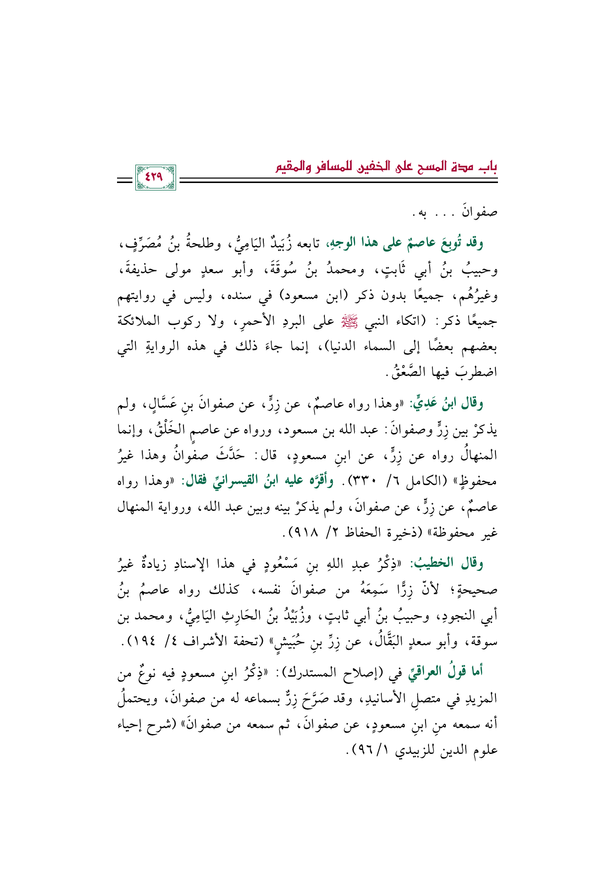 أما قولُ العراقيِّ في (إصلاح المستدرك): "ذِكْرُ ابنِ مسعودٍ فيه نوعٌ من المزيدِ في متصلِ الأسانيدِ، وقد صرَّحَ زِرٌّ بسماعه له من صفوانَ، ويحتملُ أنه سمعه من ابنِ مسعودٍ، عن صفوانَ، ثم سمعه من صفوانَ" (شرح إحياء علوم الدين للزبيدي ١/ ٩٦).