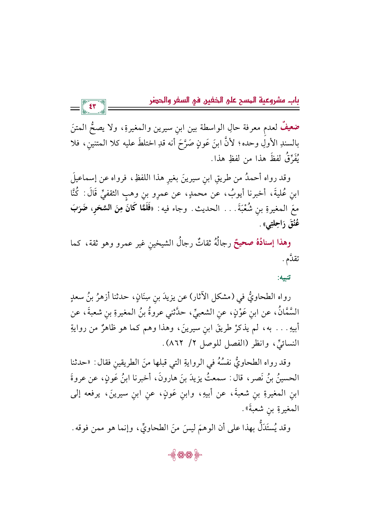 وقد رواه الطحاويُّ نفسُهُ في الروايةِ التي قبلها منَ الطريقينِ فقال: ((حدثنا الحسينُ بنُ نَصر، قال: سمعتُ يزيدَ بنَ هارونَ، أخبرنا ابنُ عَونٍ، عن عروةَ بنِ المغيرةِ بنِ شعبةَ، عن أبيهِ، وابنِ عَونٍ، عنِ ابنِ سيرينَ، يرفعه إلى المغيرةِ بنِ شعبةَ)).