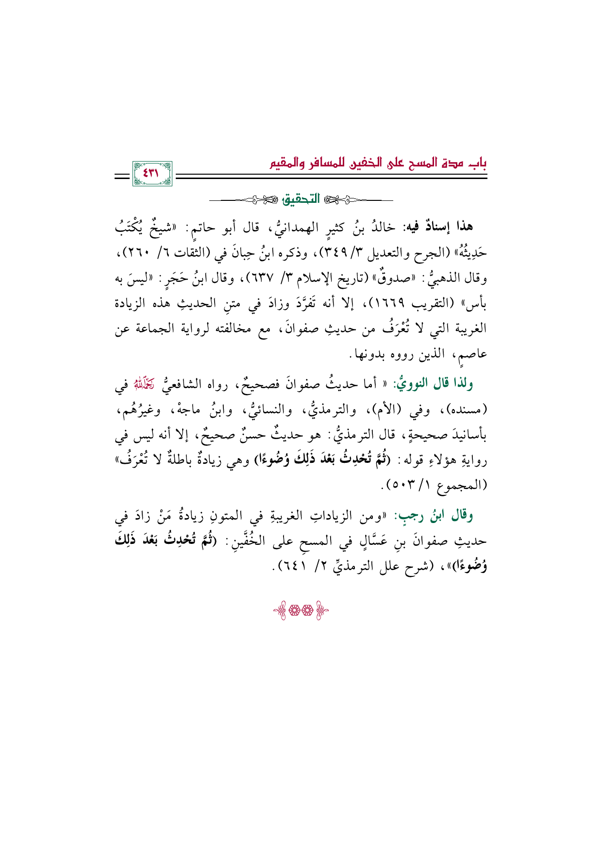 وقال ابنُ رجبٍ: "ومن الزياداتِ الغريبةِ في المتونِ زيادةُ مَنْ زادَ في حديثِ صفوانَ بنِ عَسَّالٍ في المسحِ على الخُفَّينِ: (ثُمَّ تُحْدِثُ بَعْدَ ذَلِكَ وُضُوءًا) "، (شرح علل الترمذيِّ ٢/ ٦٤١).