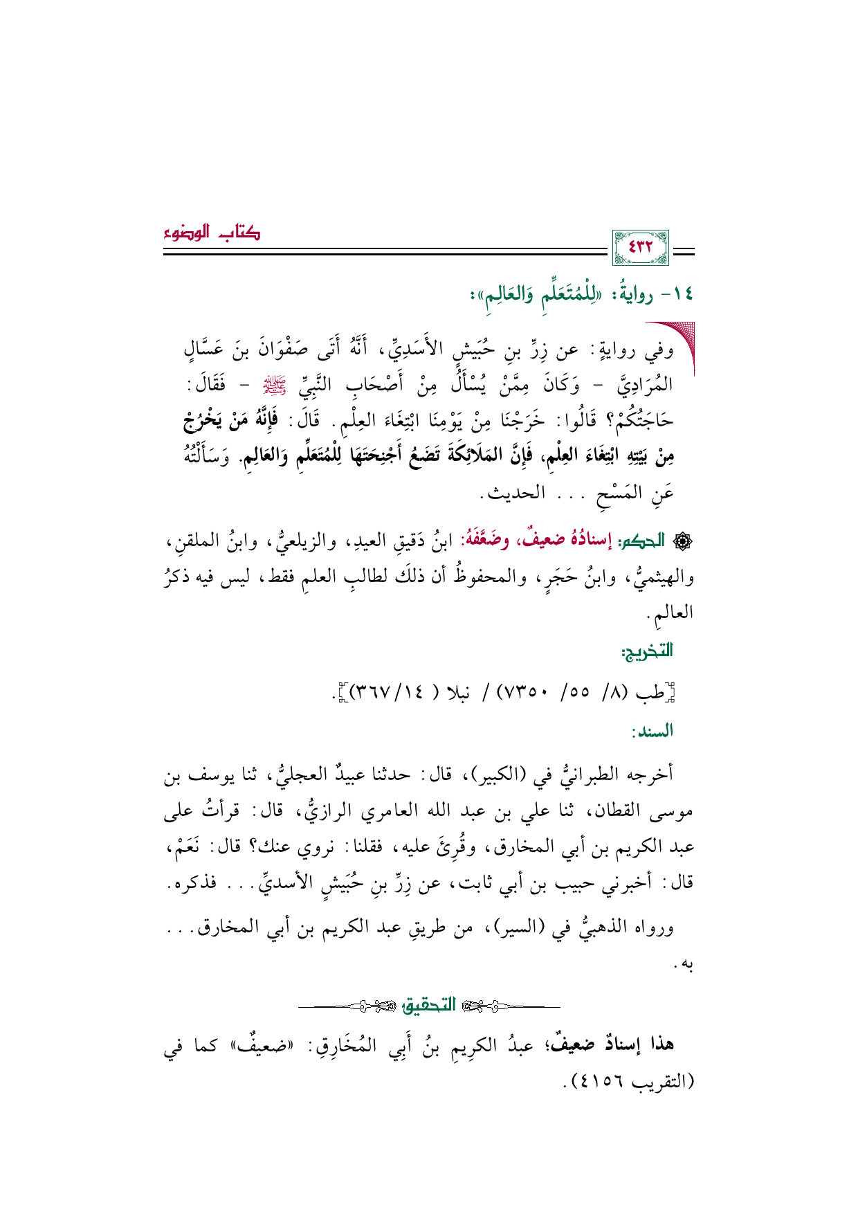 أخرجه الطبرانيُّ في (الكبير)، قال: حدثنا عبيدٌ العجليُّ، ثنا يوسف بن موسى القطان، ثنا علي بن عبد الله العامري الرازيُّ، قال: قرأتُ على عبد الكريم بن أبي المخارق، وقُرِئَ عليه، فقلنا: نروي عنك؟ قال: نَعَمْ، قال: أخبرني حبيب بن أبي ثابت، عن زِرِّ بنِ حُبَيشٍ الأسديِّ ... فذكره.