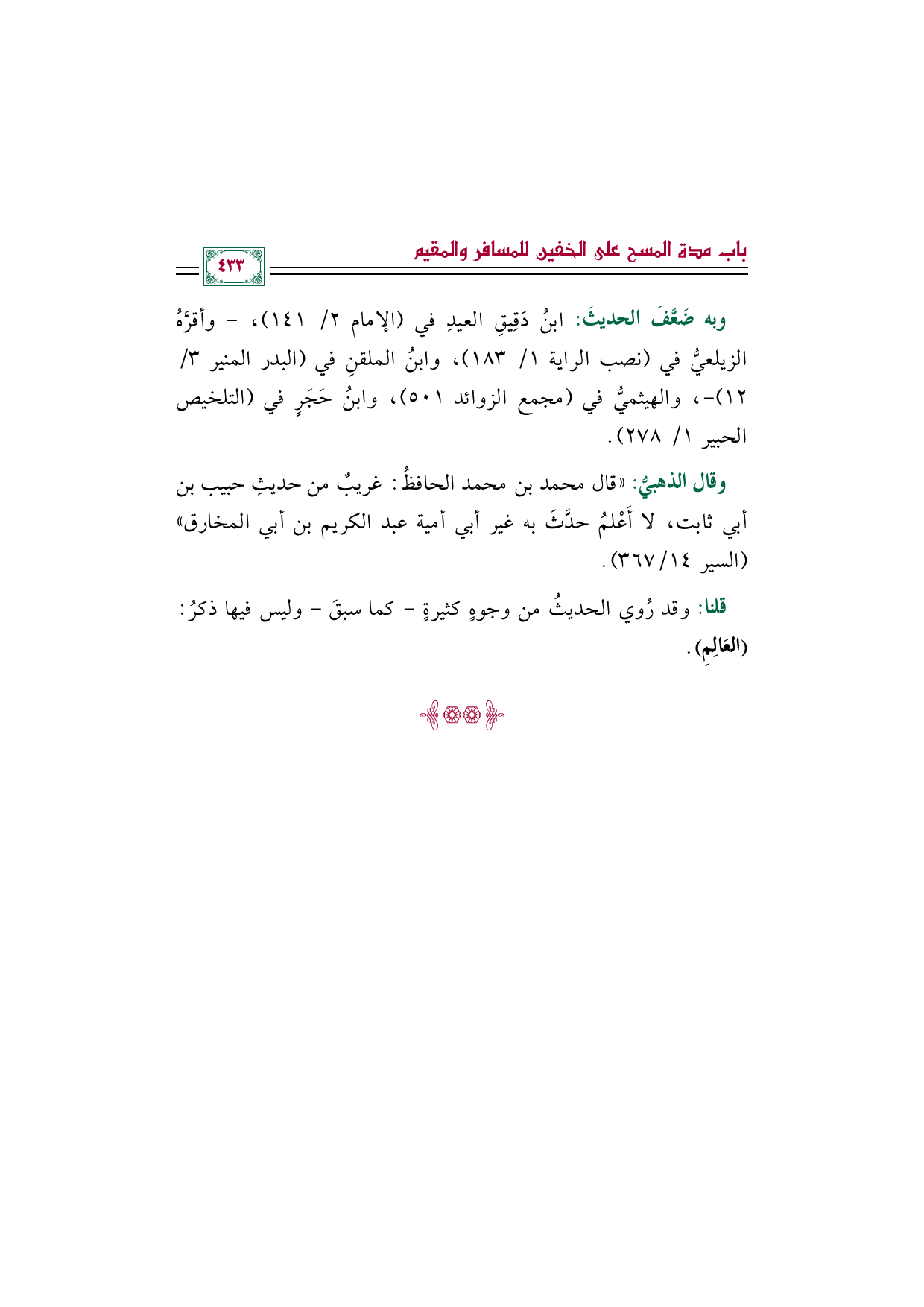 وبه ضَعَّفَ الحديثَ: ابنُ دَقيقِ العيدِ في (الإمام ٢/ ١٤١)، - وأقرَّهُ الزيلعيُّ في (نصب الراية ١/ ١٨٣)، وابنُ الملقنِ في (البدر المنير ٣/ ١٢) -، والهيثميُّ في (مجمع الزوائد ٥٠١)، وابنُ حَجَرٍ في (التلخيص الحبير ١/ ٢٧٨).