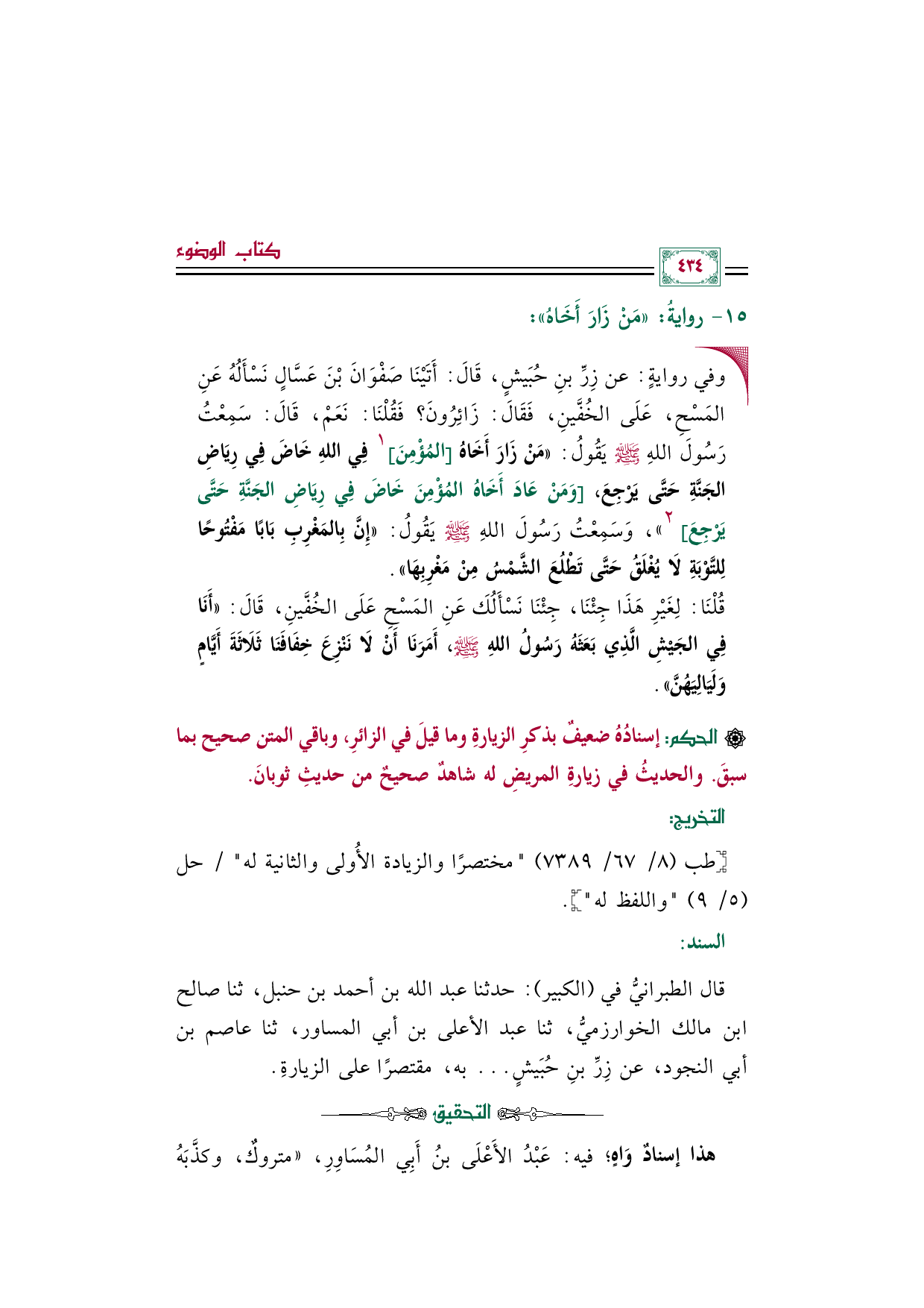 • وفي روايةٍ: عن زِرِّ بنِ حُبَيشٍ، قَالَ: أَتَيْنَا صَفْوَانَ بْنَ عَسَّالٍ نَسْأَلُهُ عَنِ المَسْحِ، عَلَى الخُفَّينِ، فَقَالَ: زَائِرُونَ؟ فَقُلْنَا: نَعَمْ، قَالَ: سَمِعْتُ رَسُولَ اللهِ صلى الله عليه وسلم يَقُولُ: ((مَنْ زَارَ أَخَاهُ [المُؤْمِنَ [١ فِي اللهِ خَاضَ فِي رِيَاضِ الجَنَّةِ حَتَّى يَرْجِعَ، [وَمَنْ عَادَ أَخَاهُ المُؤْمِنَ خَاضَ فِي رِيَاضِ الجَنَّةِ حَتَّى يَرْجِعَ [٢))، وَسَمِعْتُ رَسُولَ اللهِ صلى الله عليه وسلم يَقُولُ: ((إِنَّ بِالمَغْرِبِ بَابًا مَفْتُوحًا لِلتَّوْبَةِ لَا يُغْلَقُ حَتَّى تَطْلُعَ الشَّمْسُ مِنْ مَغْرِبِهَا)).