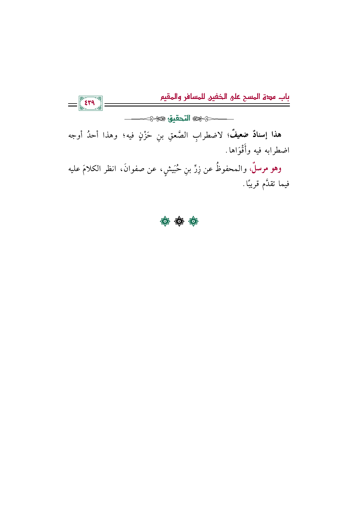 وهو مرسلٌ، والمحفوظُ عن زِرِّ بنِ حُبَيشٍ، عن صفوانَ، انظر الكلامَ عليه فيما تقدَّم قريبًا.