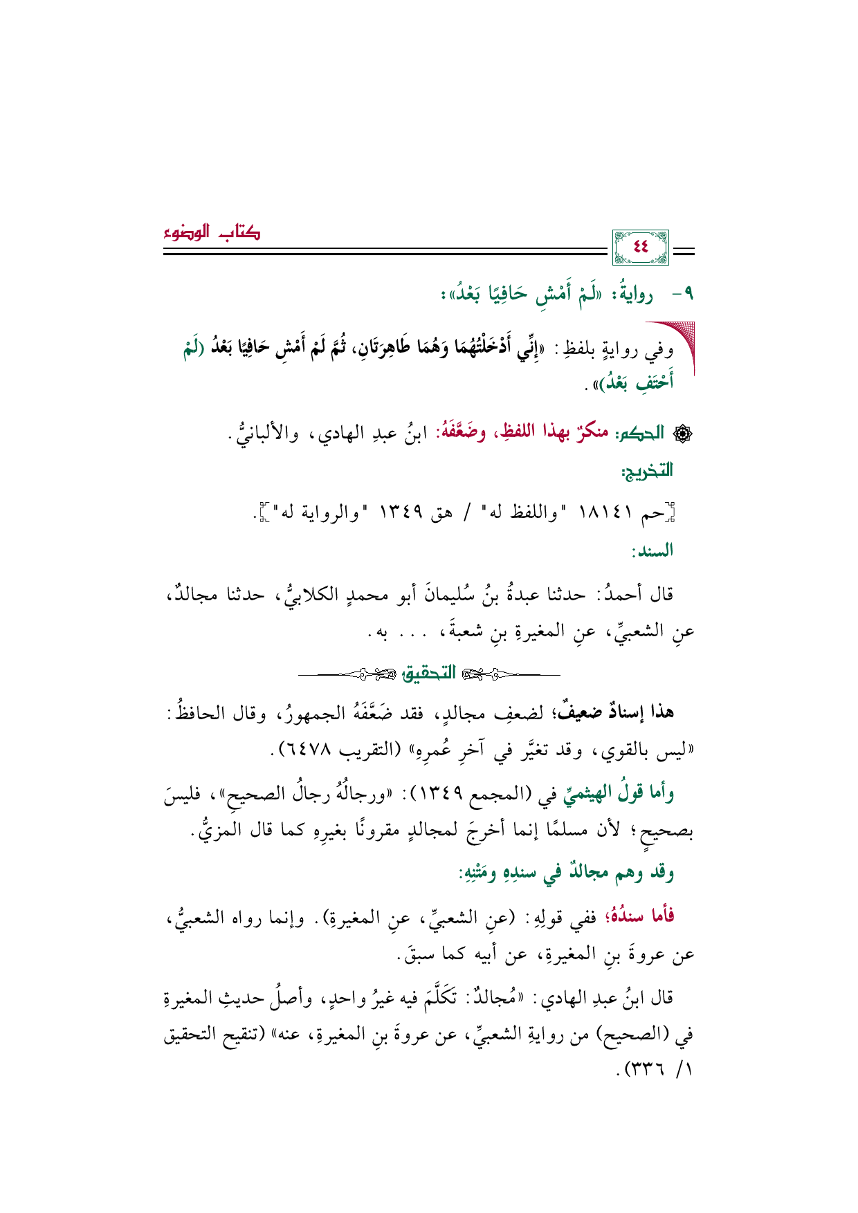 قال ابنُ عبدِ الهادي: ((مُجالدٌ: تَكَلَّمَ فيه غيرُ واحدٍ، وأصلُ حديثِ المغيرةِ في (الصحيح) من روايةِ الشعبيِّ، عن عروةَ بنِ المغيرةِ، عنه)) (تنقيح التحقيق ١/ ٣٣٦).