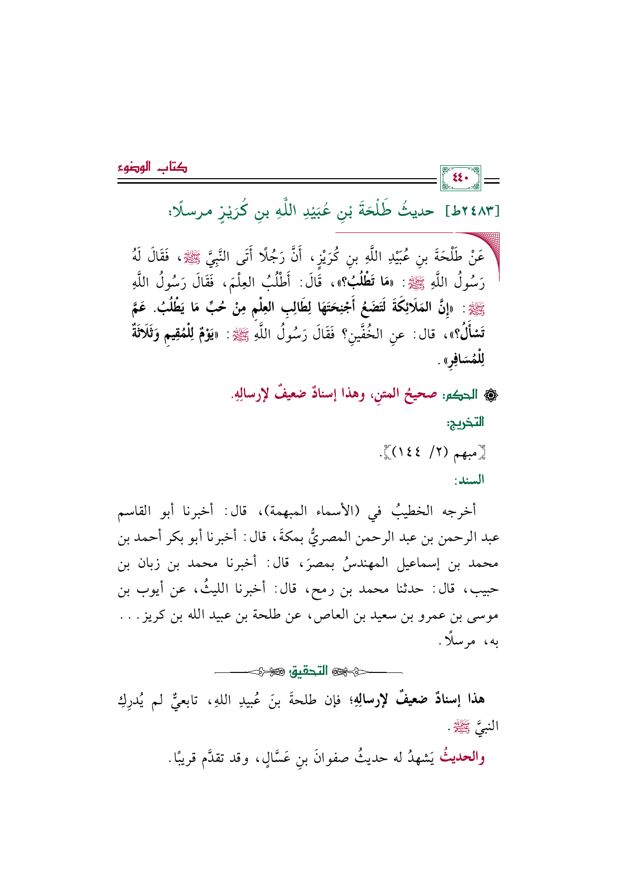 ◼ عَنْ طَلْحَةَ بْنِ عُبَيْدِ اللَّهِ بْنِ كُرَيْزٍ، أَنَّ رَجُلًا أَتَى النَّبِيَّ صلى الله عليه وسلم، فَقَالَ لَهُ رَسُولُ اللَّهِ صلى الله عليه وسلم: ((مَا تَطْلُبُ؟ ))، قَالَ: أَطْلُبُ العِلْمَ، فَقَالَ رَسُولُ اللَّهِ صلى الله عليه وسلم: ((إِنَّ المَلائِكَةَ لَتَضَعُ أَجْنِحَتَهَا لِطَالِبِ العِلْمِ مِنْ حُبِّ مَا يَطْلُبُ. عَمَّ تَسْأَلُ؟ ))، قال: عنِ الخُفَّينِ؟ فَقَالَ رَسُولُ اللَّهِ صلى الله عليه وسلم: ((يَوْمٌ لِلْمُقِيمِ وَثَلاثَةٌ لِلْمُسَافِرِ)).