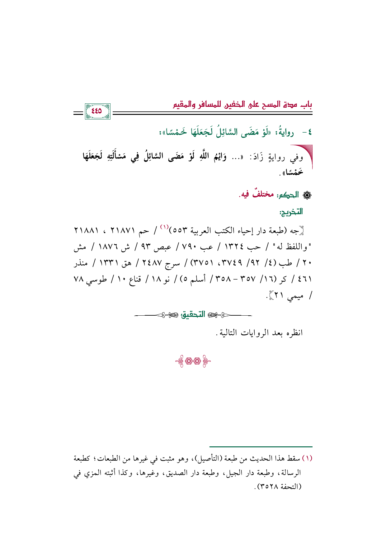 روايةُ: لَوْ مَضَى السَّائِلُ لَجَعَلَهَا خَمْسًا: