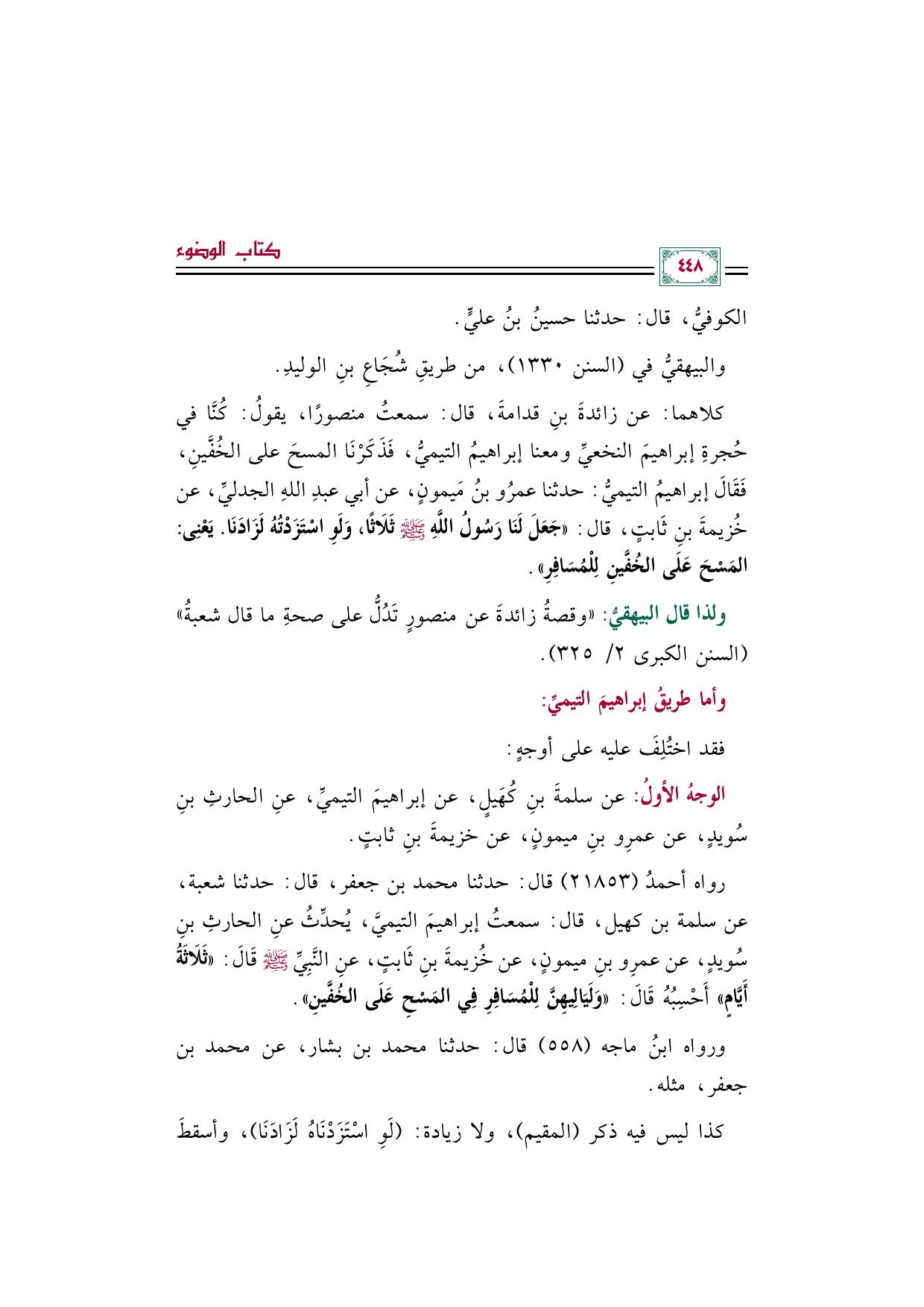 كلاهما: عن زائدةَ بنِ قدامةَ، قال: سمعتُ منصورًا، يقولُ: كنَّا فى حُجرةِ إبراهيمَ النخعيِّ ومعنا إبراهيمُ التيميُّ، فذكرنا المسحَ على الخُفَّينِ، فَقَالَ إبراهيمُ التيميُّ: حدثنا عمرُو بنُ مَيمونٍ، عن أبي عبدِ اللهِ الجدليِّ، عن خزيمةَ بنِ ثَابتٍ، قال: ((جَعَلَ لَنَا رَسُولُ اللَّهِ صلى الله عليه وسلم ثَلَاثًا، وَلَوِ اسْتَزَدْتُهُ لَزَادَنَا. يَعْنِى: المَسْحَ عَلَى الخُفَّينِ لِلْمُسَافِرِ)).