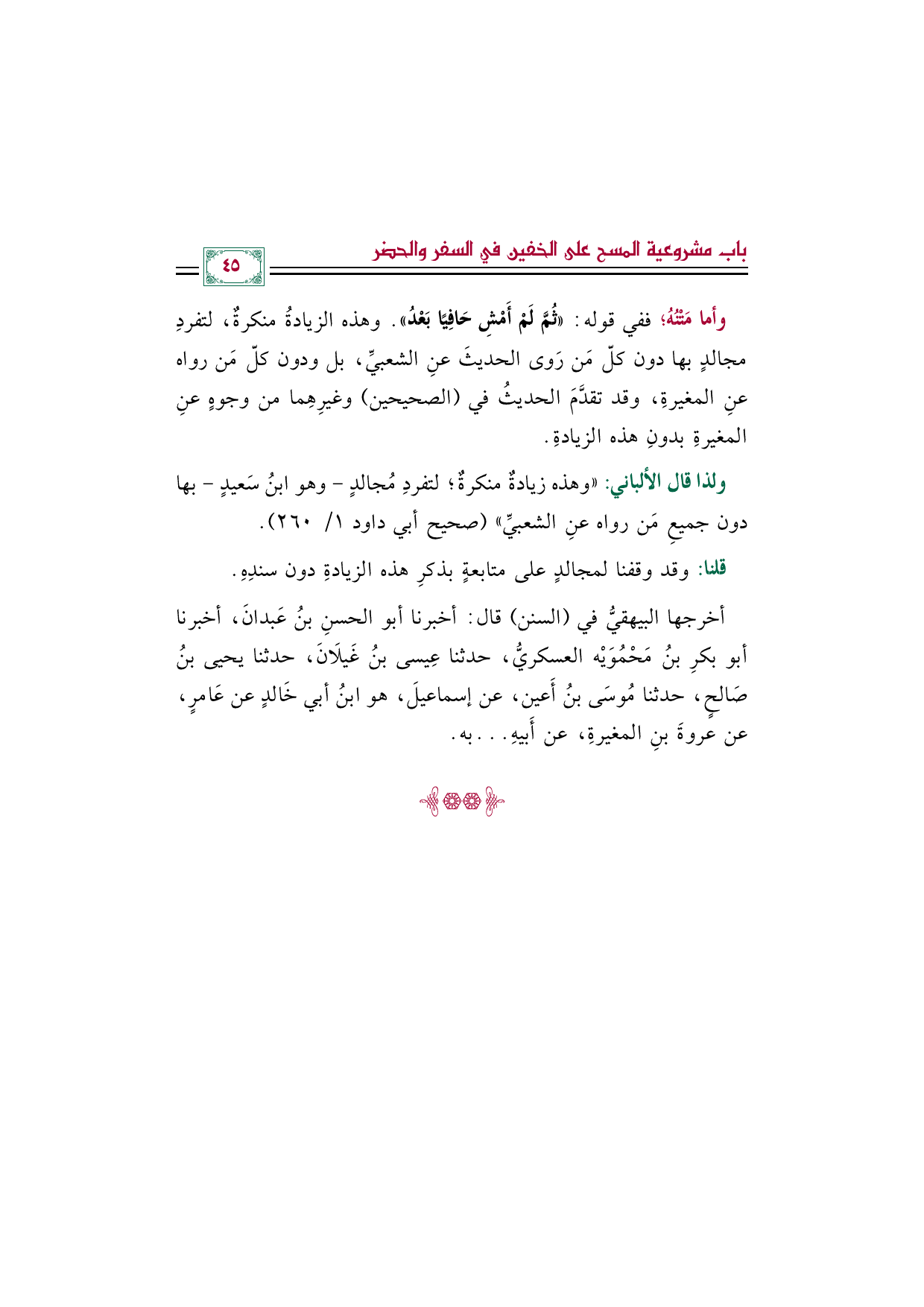 وأما مَتْنُهُ؛ ففي قوله: ((ثُمَّ لَمْ أَمْشِ حَافِيًا بَعْدُ)). وهذه الزيادةُ منكرةٌ، لتفردِ مجالدٍ بها دون كلّ مَن رَوى الحديثَ عنِ الشعبيِّ، بل ودون كلّ مَن رواه عنِ المغيرةِ، وقد تقدَّمَ الحديثُ في (الصحيحين) وغيرِهِما من وجوهٍ عنِ المغيرةِ بدونِ هذه الزيادةِ.