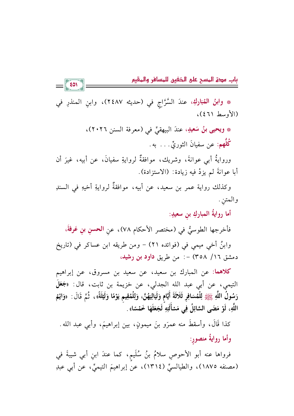 (فوائده ٢١) -ومن طريقه ابن عساكر في (تاريخ دمشق ١٦/ ٣٥٨) -: من طريق داود بن رشيد، كلاهما: عن المبارك بن سعيد، عن سعيد بن مسروق، عن إبراهيم التيمي، عن أبي عبد الله الجدلي، عن خزيمة بن ثابت، قال: ((جَعَلَ رَسُولُ اللَّهِ صلى الله عليه وسلم لِلْمُسَافِرِ ثَلَاثَةَ أَيَّامٍ وَلَيَالِيَهُنَّ، وَلِلْمُقِيمِ يَوْمًا وَلَيْلَةً))، ثُمَّ قَالَ: ((وَايْمُ اللَّهِ، لَوْ مَضَى السَّائِلُ فِي مَسْأَلَتِهِ لَجَعَلَهَا خَمْسًا)).