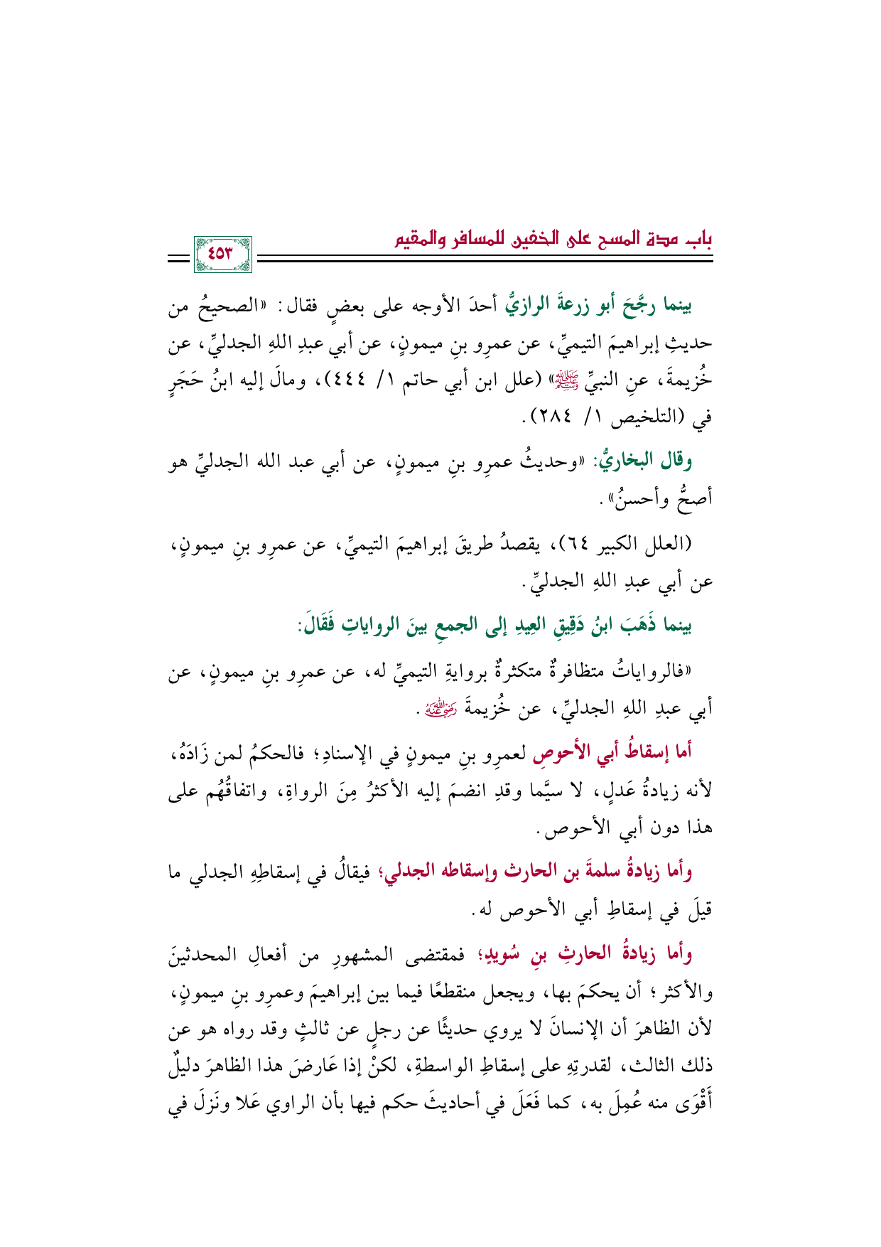 بينما رجَّحَ أبو زرعةَ الرازيُّ أحدَ الأوجه على بعضٍ فقال: "الصحيحُ من حديثِ إبراهيمَ التيميِّ، عن عمرِو بنِ ميمونٍ، عن أبي عبد الله الجدليِّ، عن خُزيمةَ، عنِ النبيِّ صلى الله عليه وسلم" (علل ابن أبي حاتم ١/ ٤٤٤)، ومالَ إليه ابنُ حَجَرٍ في (التلخيص ١/ ٢٨٤).