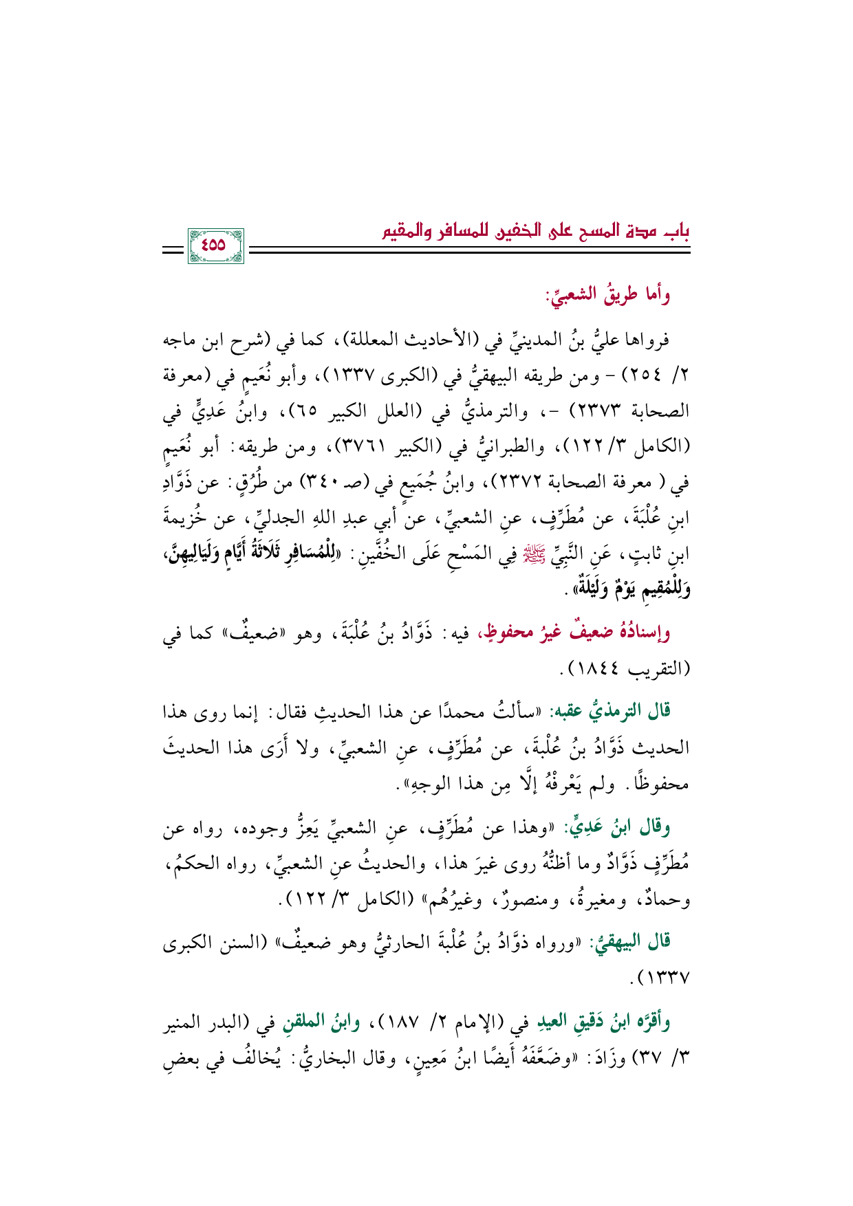 فرواها عليُّ بنُ المدينيِّ في (الأحاديث المعللة)، كما في (شرح ابن ماجه ٢/ ٢٥٤) -ومن طريقه البيهقيُّ في (الكبرى ١٣٣٧)، وأبو نُعَيمٍ في (معرفة الصحابة ٢٣٧٣) -، والترمذيُّ في (العلل الكبير ٦٥)، وابنُ عَدِيٍّ في (الكامل ٣/ ١٢٢)، والطبرانيُّ في (الكبير ٣٧٦١) - ومن طريقه: أبو نُعَيمٍ في (معرفة الصحابة ٢٣٧٢)، وابنُ جُمَيعٍ في (صـ ٣٤٠) من طُرُقٍ: عن ذَوَّادِ بنِ عُلْبَةَ، عن مُطَرِّفٍ، عنِ الشعبيِّ، عن أبي عبدِ اللهِ الجدليِّ، عن خُزيمةَ بنِ ثابتٍ، عَنِ النَّبِيِّ صلى الله عليه وسلم فِي المَسْحِ عَلَى الخُفَّينِ: «لِلْمُسَافِرِ ثَلَاثَةُ أَيَّامٍ وَلَيَالِيهِنَّ، وَلِلْمُقِيمِ يَوْمٌ وَلَيْلَةٌ».
