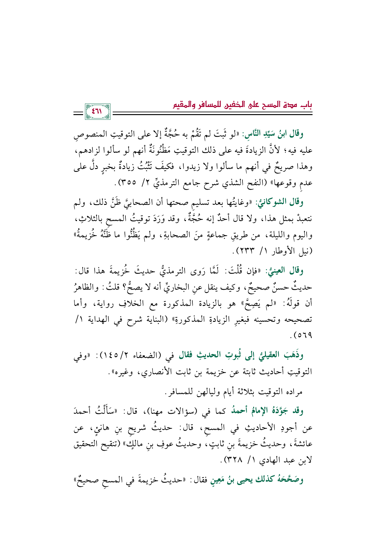 وقال الشوكانيُّ: ((وغايتُها بعد تسليمِ صحتها أن الصحابيَّ ظنَّ ذلك، ولم نتعبد بمثل هذا، ولا قال أحدٌ إنه حجةٌ، وقد وَرَدَ توقيتُ المسحِ بالثلاثِ، واليوم والليلة، من طريقِ جماعةٍ منَ الصحابةِ، ولم يَظنوا ما ظَنَّهُ خزيمةُ)) (نيل الأوطار ١/ ٢٣٣).