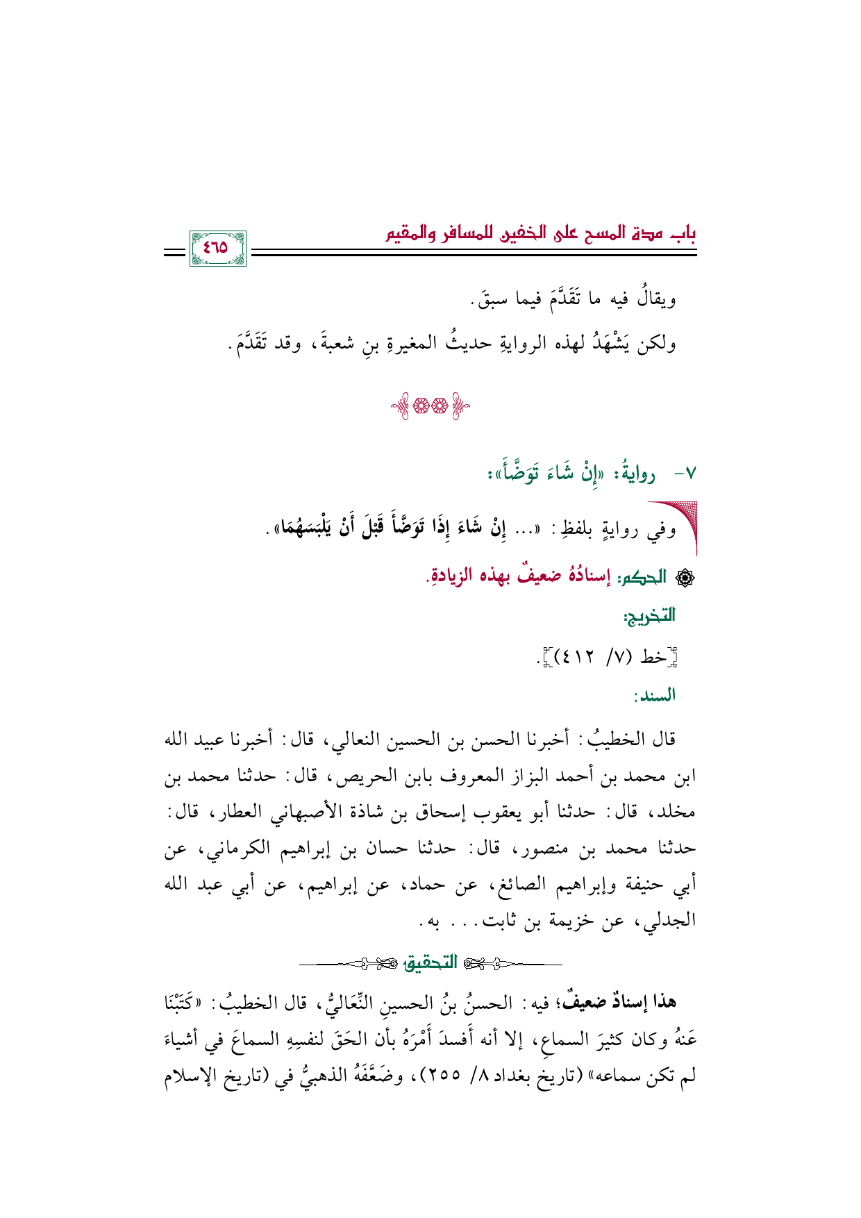 قال الخطيبُ: أخبرنا الحسن بن الحسين النعالي، قال: أخبرنا عبيد الله بن محمد بن أحمد البزاز المعروف بابن الحريص، قال: حدثنا محمد بن مخلد، قال: حدثنا أبو يعقوب إسحاق بن شاذة الأصبهاني العطار، قال: حدثنا محمد بن منصور، قال: حدثنا حسان بن إبراهيم الكرماني، عن أبي حنيفة وإبراهيم الصائغ، عن حماد، عن إبراهيم، عن أبي عبد الله الجدلي، عن خزيمة بن ثابت ... به.