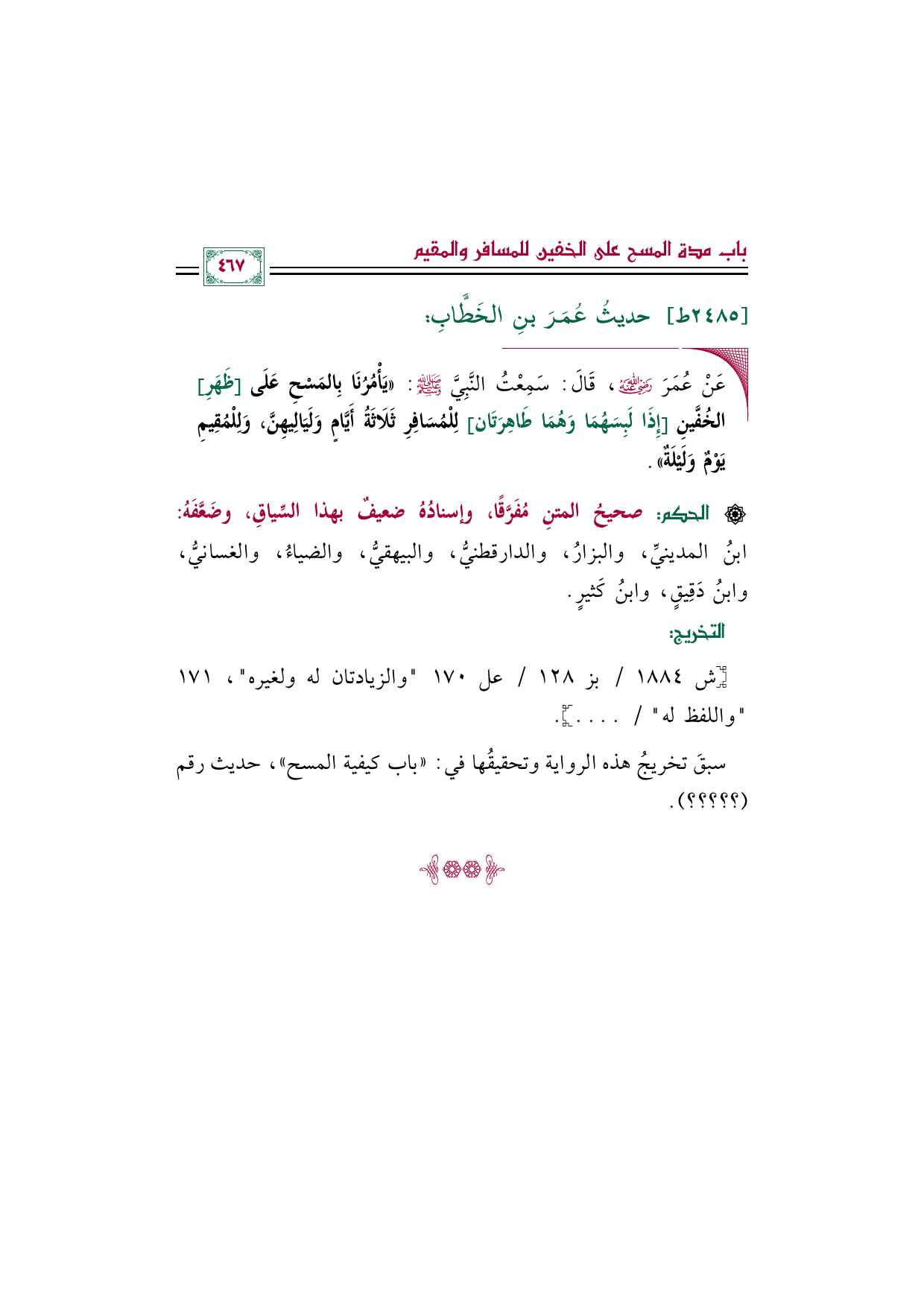 ◼ عَنْ عُمَرَ رضي الله عنه، قَالَ: سَمِعْتُ النَّبِيَّ صلى الله عليه وسلم: «يَأْمُرُنَا بِالمَسْحِ عَلَى [ظَهَرِ] الخُفَّينِ [إِذَا لَبِسَهُمَا وَهُمَا طَاهِرَتَان [لِلْمُسَافِرِ ثَلَاثَةُ أَيَّامٍ وَلَيَالِيهِنَّ، وَلِلْمُقِيمِ يَوْمٌ وَلَيْلَةٌ».