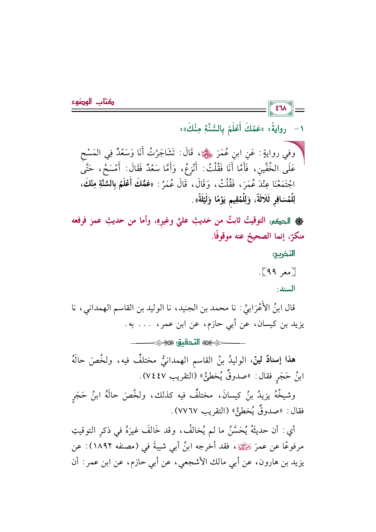أي: أن حديثَهُ يُحَسَّنُ ما لم يخالفْ، وقد خالفَ غيرَهُ في ذكرِ التوقيتِ مرفوعًا عن عمرَ رضي الله عنه، فقد أخرجه ابنُ أبي شيبةَ في (مصنفه ١٨٩٢): عن يزيد بن هارون، عن أبي مالك الأشجعي، عن أبي حازم، عن ابن عمر: أن